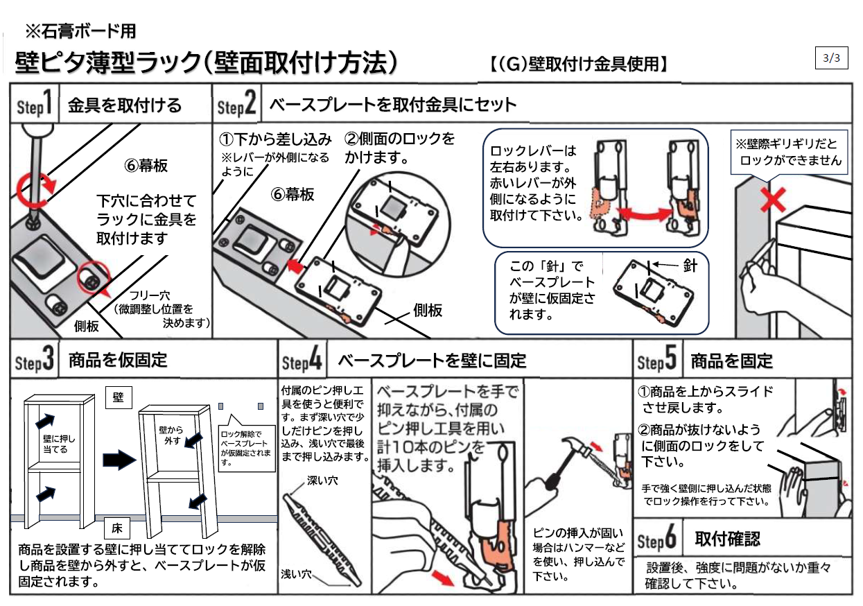 石膏ボードの壁に付属の壁面固定具で誰でも簡単に設置でき、取り外し後は壁の針跡も目立ちません。