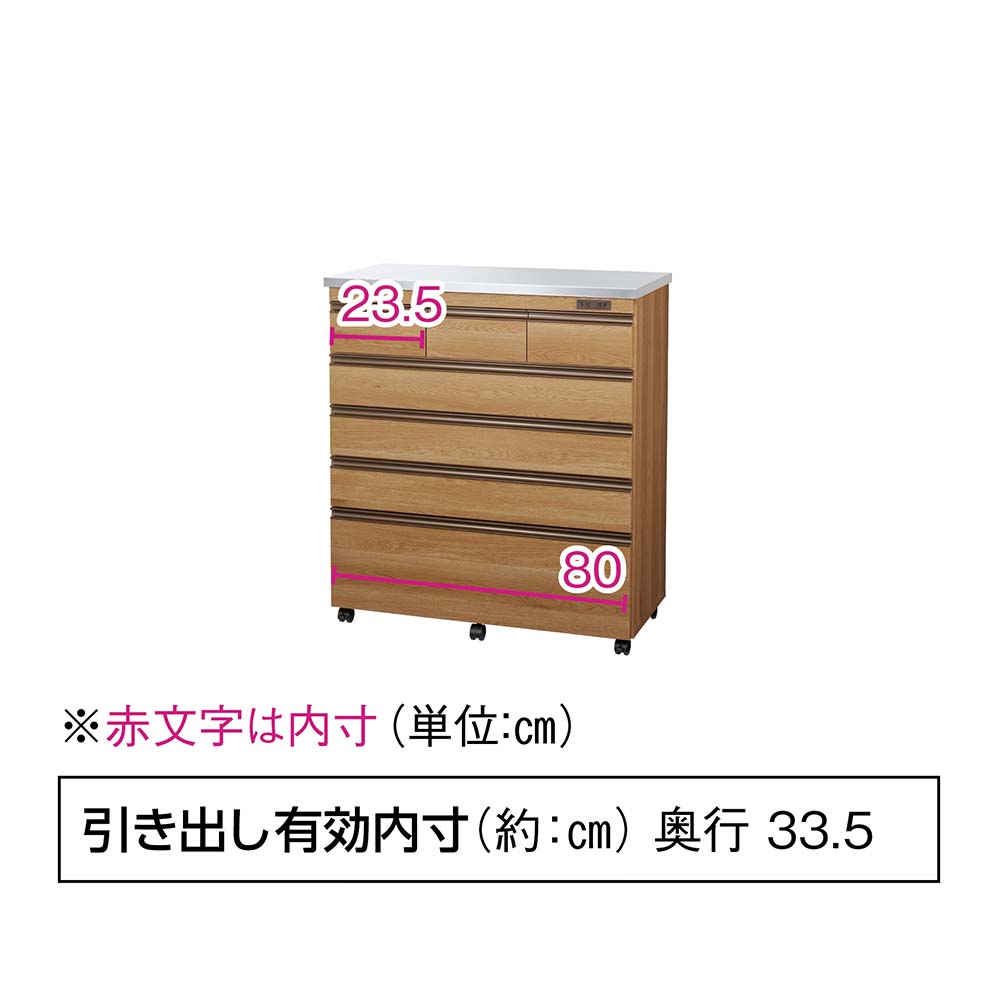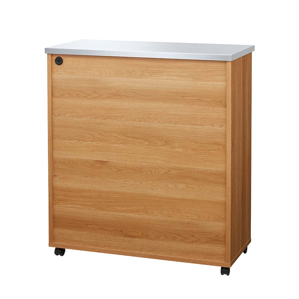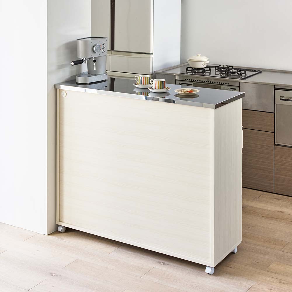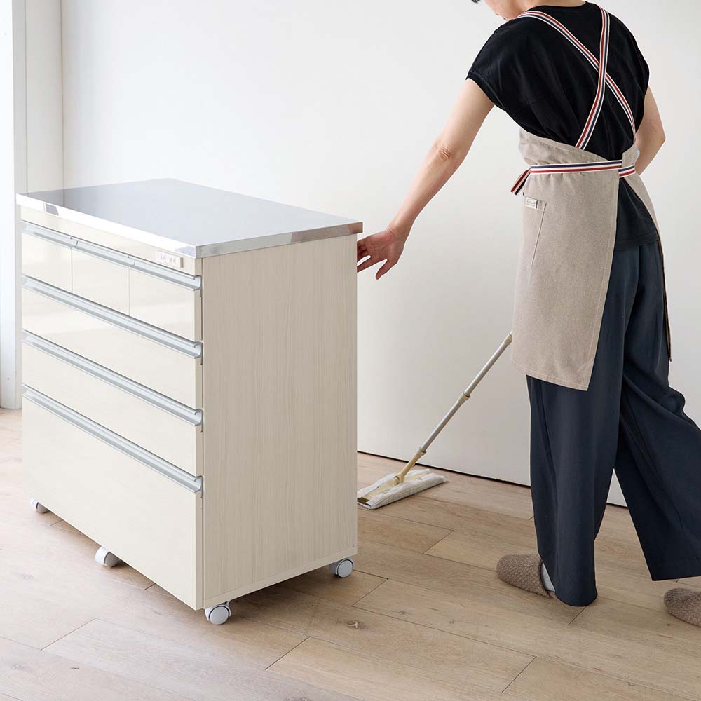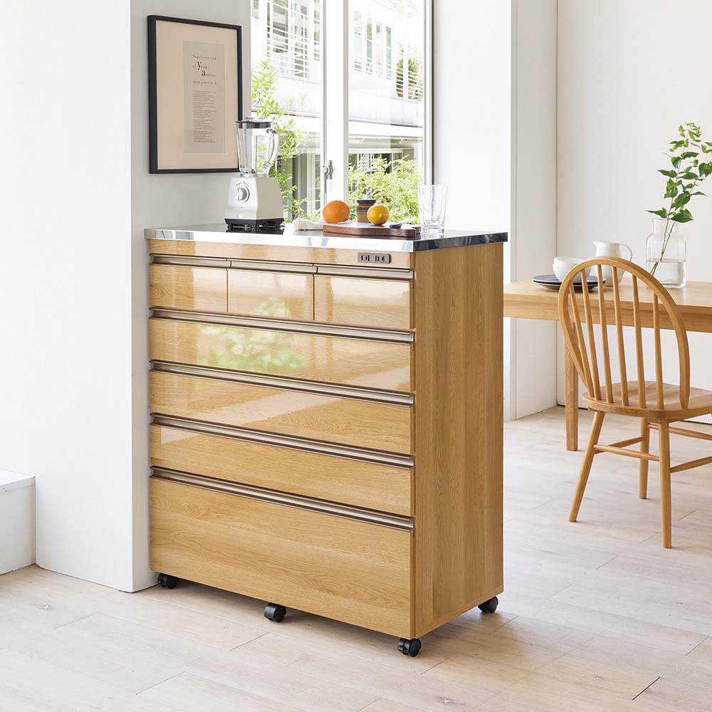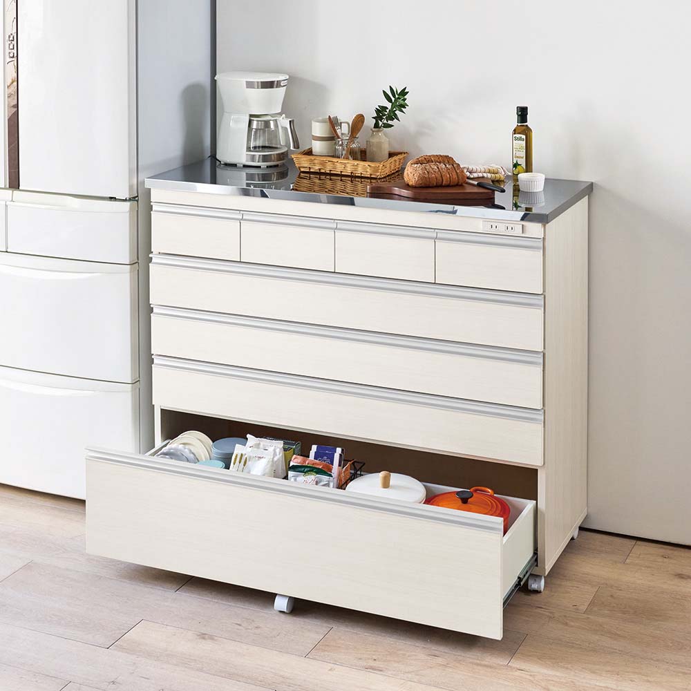使いやすさと安心感を両立したステンレス天板カウンター。天板は作業台として使いやすく、深さの違う引き出し付き。作業と収納と収納がこれ一台でこなせます。高さは4段、5段の2タイプ、幅は、60cm・90cm・120cmの3タイプ。キャスター付きなので、簡単に移動が出来てお掃除もラクラク。背面も化粧仕上げでキッチンとダイニングの間仕切りにしてアイランドキッチンのようにも使えます。天板までしっかり使えるから、作業スペースも広がる水や熱に強いステンレス天板は、調理中の一時置きにも頼れる存在。熱い鍋も濡れたままの食器も気兼ねなく置けるので、キッチンの作業台としても重宝します。圧迫感がないから、空間も広々背の高い一般的なキッチンボードや食器棚と比較し、カウンタータイプの本商品は重心が低いので、万が一の災害時にも転倒リスクが少なく安心です。背が高くないのでキッチンやダイニングにゆとり感が生まれ、部屋全体が明るく見えるのも嬉しいポイント。出し入れしやすく、使いやすい高さ上段はカトラリーや調味料などの小物類に、下段のフルスライドレール付き引き出しは、かさばるストック食材や調理器具までしっかり収納。高い位置に手を伸ばすことなく、毎日の家事をラクにしてくれます。清潔感と高級感を両立した、ステンレス天板キラリと輝くステンレスは、水や汚れに強く、さっと拭くだけでお手入れも簡単。作業台としても、小型家電を置くレンジ台としても、幅広く活躍します。背面もきれいだから、間仕切り使いにも背面まで化粧仕上げされているので、キッチンとダイニングの間に置いても美しく。生活感の出やすいキッチン側を自然に目隠しして、ダイニングからの印象もすっきり整います。移動がラクでお掃除しやすいキャスター付きだから中身を入れたままでも移動がスムーズ。ちょっと動かして床をお掃除するときも便利です。キャスター(前輪)にはストッパー付きで安心。家電に便利な2口コンセント(計1500W)付き正面上部には電子レンジ、コーヒーメーカー、パン焼き機、トースターなどの家電に便利なコンセント付です。