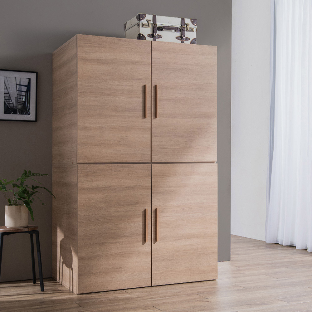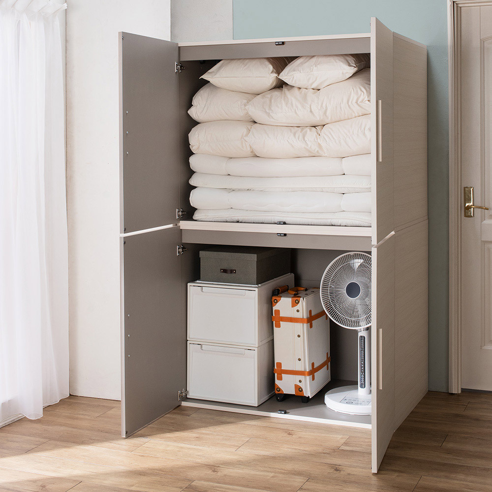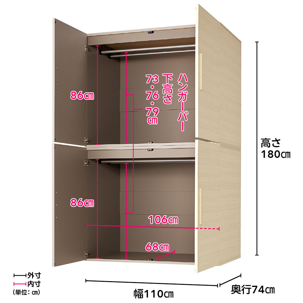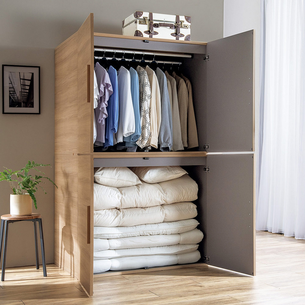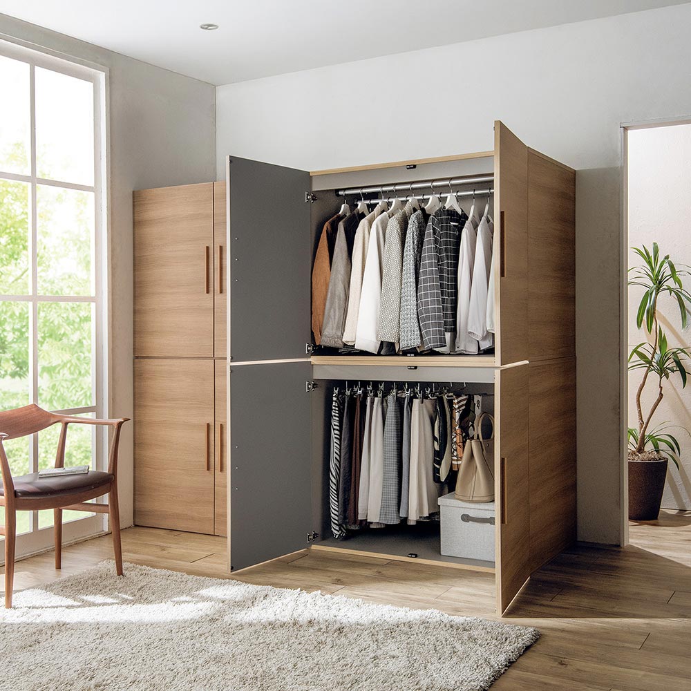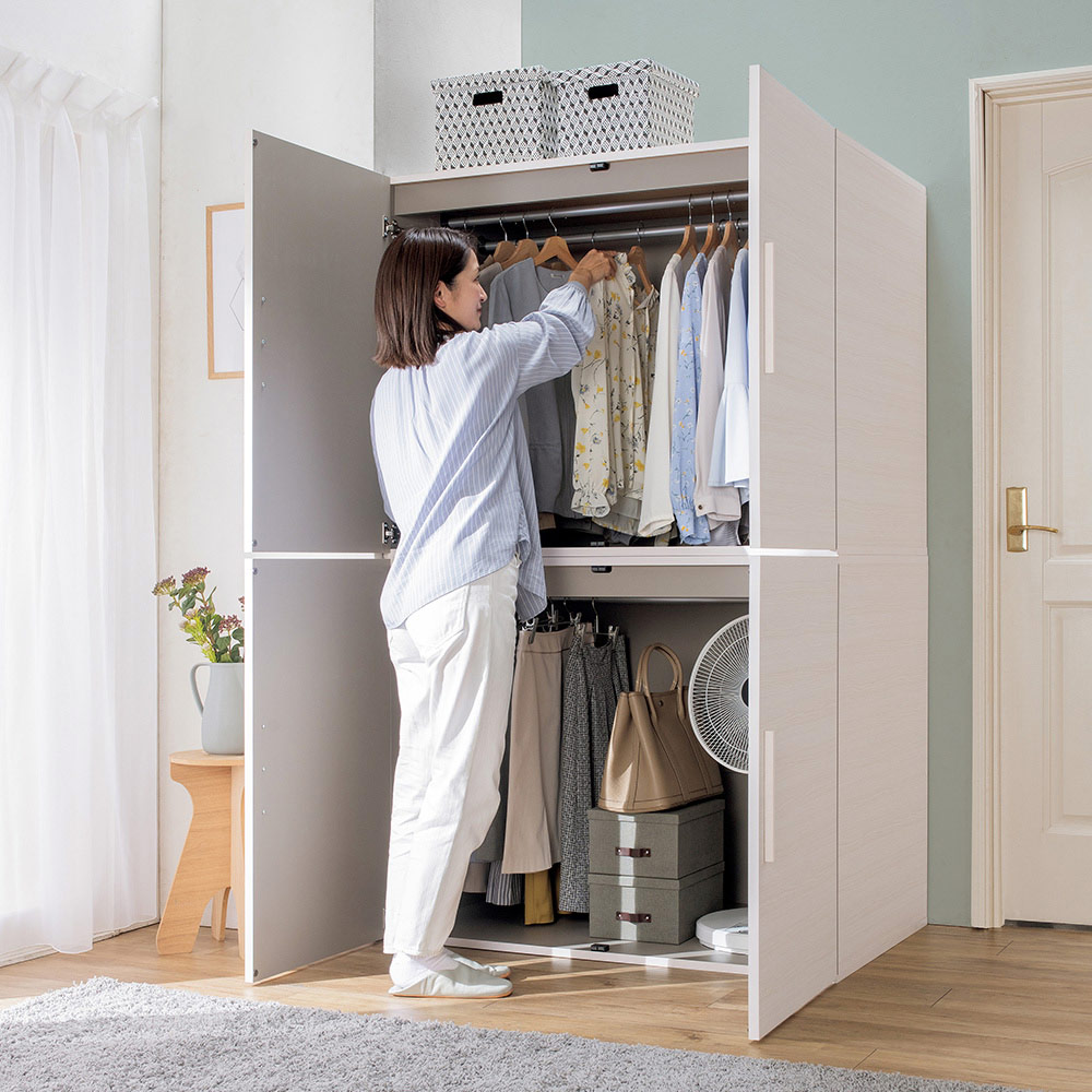 とにかく服を大量にしまいたい!という方に。オールシーズンの服が一挙にしまえる前後2列のダブルハンガー×上下2段の超大容量。インテリアに調和するデザイン性の高さで置き場所を選ばず、部屋置きしてもおしゃれです。ウォークインクローゼット並みの収納力を1台で(ア)ナチュラルオーク ※写真は2台並べています。とにかく服をたくさん収納したい!という方に。前後2列のダブルハンガー×上下2段で、まるでウォークインクローゼットのような大量収納を可能にしました。衣類はもちろん布団や家電もしまえる、クローゼットと押し入れのいいとこどりで、限られた空間を効率よく活かしたい現代の収納スタイルにもフィットします。インテリアに調和するデザイン性の高さ(ア)ナチュラルオーク近年のインテリアのトレンドに合わせたカラー展開なので、部屋置きしてもおしゃれです。上品な木目調仕上げで、ナチュラルオークはどんなお部屋にもなじみやすい色合いです。押し入れのないお宅の布団収納にも(ア)ナチュラルオーク内寸奥行68cm高さ79cmなので3つ折りの敷き布団やマットレスも収納できます。ベッドをお使いの場合も、オフシーズンの羽毛掛け布団や毛布などかさばる寝具の収納に便利。布団など大きいものを収納する際は、ハンガーバーは取り外しできます。白を基調としたインテリアにも好相性(イ)ホワイト洗練された印象で、フレンチモダンなどおしゃれなインテリアにもなじむホワイト。お部屋の雰囲気を損なわずに置ける大容量収納庫を探していた方に。前後2列のダブルハンガー×上下2段の収納力(イ)ホワイト大きな収納力の秘密は、上下段とも前後2列のダブルハンガー仕様。奥にも手前にも服がたっぷり掛けられます。さらにオフシーズンの家電や収納ケースなど多様なものがしまえるゆとりの収納力で、お部屋がすっきり片づきます。シングルハンガーと比べると収納量は1.5倍以上(イ)ホワイト収納部は上下段ともに前後ダブルハンガー仕様で、シングルハンガーと比較すると収納力最大1.5倍以上。ハンガーバーの高さは3段階で変えられるので、奥の服も取り出しやすくなります。インテリアに調和する佇まい(イ)ホワイト上段、下段ともに同じ仕様なので、横並びに設置することもできます。ダイニングやリビングに置いても圧迫感がなく、見た目はクローゼットに見えない印象でありながら実はたっぷり収納可能。外出前後に脱ぎ着するアウターや、プライベートルームに収まりきらない服をしまうファミリークローゼットとして使っても便利です。普段は見えない内側も高級感のある仕上げ写真左:(ア)ナチュラルオーク 写真右:(イ)ホワイト(ア)(イ)とも内側の色はマットなグレーを採用。扉を開けなければ見えないところも高級感ある仕上げです。色合いと質感にもこだわった2色展開写真左:(ア)ナチュラルオーク 写真右:(イ)ホワイト(ア)ナチュラルオークと(イ)ホワイト(木目)の2色展開。上下連結金具が付いているのでしっかり固定できます。安心の国産品です。取っ手も木目調でスタイリッシュ本体と統一感のある木目調のデザインが上品です。つかみやすい大型の引手なので、開閉もラクラクです。