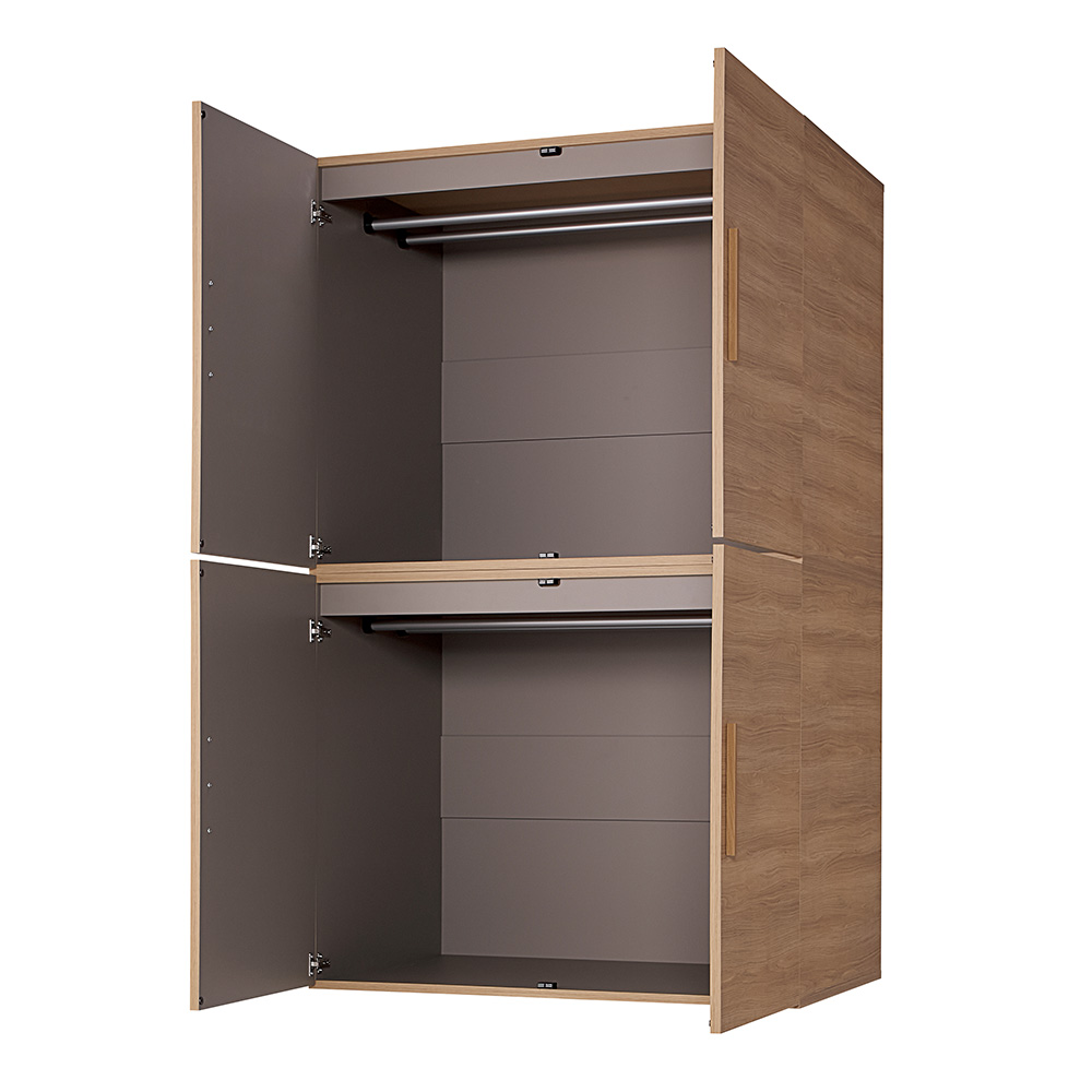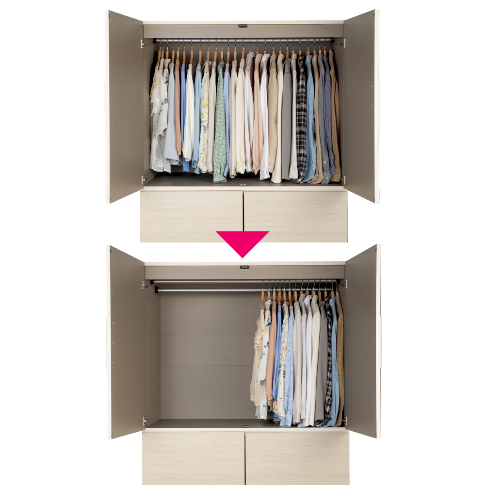 収納部は上下段ともに前後ダブルハンガー仕様で、シングルハンガーと比較した場合に約1.5倍の収納量。ハンガーバーの高さは2段階で変えられるので、奥の服も取り出しやすくなります。