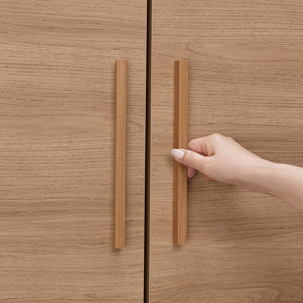 取っ手は本体と同じ木目のスタイリッシュなデザイン。つかみやすい大型の引手なので開閉も楽々。