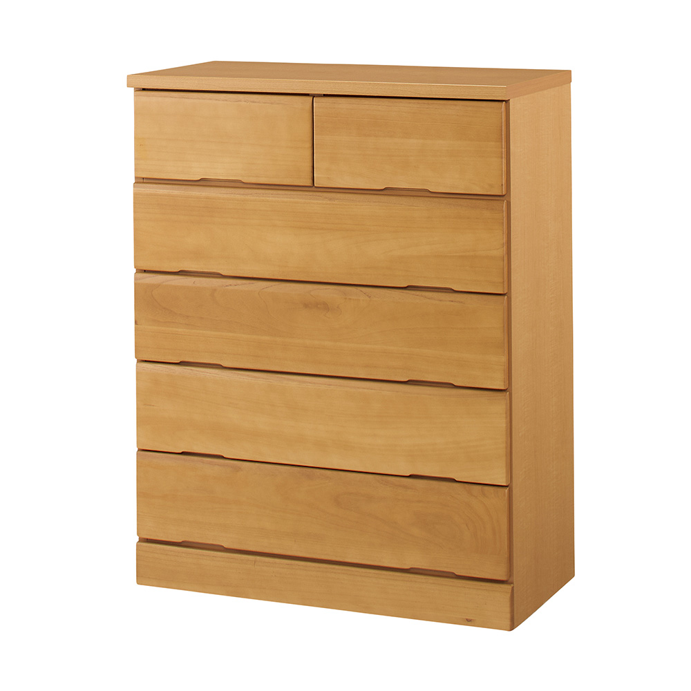(ア)ナチュラル 天然木の国産完成品ながら、驚きのハイコスパ!お子さまにもやさしい手触りと機能性で、本体には転倒防止金具付きです。 ※写真左から5段・幅60cmタイプ、5段・幅80cmタイプです。