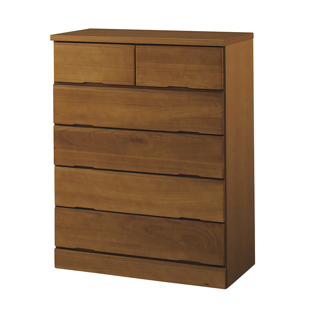 天然木を使った国産品、しかも組立不要の完成品チェストを驚きの価格で!収納を増やしたい。衣装ケースは部屋に置きたくない。リビングにチェストがほしい。あまり予算をかけたくない。家具の組立は苦手。まるっとおまかせです。天然木の国産完成品ながら驚きのハイコスパ!(ア)ナチュラル 写真左から4段・幅80cm、4段・幅60cm、5段・幅45cmタイプクローゼットや押し入れにチェストをしまうと、ダブルアクションになって面倒だし家族が自分で出し入れしにくい。もっと手近なリビングにこそ収納があったら便利ですよね。天然木の国産品なのに低予算、衣装ケースのように豊富なサイズ展開、組立要らずの完成品。かゆいところに手が届くチェストです。どんなインテリアにも溶け込むデザイン(イ)ブラウン 写真左から4段・幅45cm、3段・幅60cm、3段・幅80cmタイプさりげない上質感はリビングにもおすすめ。スペースに合わせて豊富なサイズから選べます。本体奥行40cmは、たっぷりの収納量を確保しながら圧迫感なく置ける絶妙なサイズ感です。家族で毎日使うチェストとしても(ア)ナチュラル 写真左から5段・幅60cm、5段・幅80cmタイプお子さまにも優しい手ざわりと機能性。お片づけの習慣づけにもぴったりのチェストです。転倒防止金具付きで安心です。3段タイプはナイトテーブルとしても(イ)ブラウン 写真は3段・幅45cmタイプ寝室でナイトテーブル代わりにも。おやすみ前に読みたい本やメガネなど、ちょっとしたものが収納できて便利です。幅3タイプ高さ3タイプから選べる豊富なサイズ展開(ア)ナチュラルサイズが豊富に選べる天然木レール付きチェストシリーズは、幅は45cm・60cm・80cmの3タイプ。高さは3段(67cm)・4段(85cm)・5段(103cm)の3タイプ、色はナチュラルとブラウンの2色展開で、お部屋に合わせてお選びいただけます。国内メーカーが丁寧に仕上げて完成品でお届けしますので、届いたらすぐお使いいただけます。小引き出しは整理しやすい仕切り付き(ア)ナチュラル最上段の小引き出しには小分けの仕切り付きで、下着や靴下など細々した物を整頓しながら収納できます。 ※仕切りは取り外せます。スライドレール付きで開閉がスムーズ(イ)ブラウン大引き出しはスライドレール付き。たっぷり収納してもなめらかに開閉できます。お子さまからご年配の方までどなたにもストレスなくお使いいただけます。大引き出し1杯の収納目安(幅45cm・60cmタイプ)写真左:幅45cmタイプ 写真右:幅60cmタイプ幅45cmは服1列(約5着)+ゆとりのスペース、幅60mは服2列(約10着)が収納の目安です。シャツや薄手のカットソー等を収納して検証しています。大引き出し1杯の収納目安(幅80cmタイプ)写真は幅80cmタイプ幅80cmは服3列(約15着)が収納の目安です。シャツや薄手のカットソー等を収納して検証しています。桐天然木のやわらかな木肌感写真左:(ア)ナチュラル 写真右:(イ)ブラウン引き出し前板には、着物箪笥などで古来から愛されている桐天然木を使い、キズや汚れがつきにくいようウレタン樹脂塗装を施しました。ぬくもりを感じる素材感を生かし、引き出し上部に丸みをもたせて肌当たり優しく仕上げました。