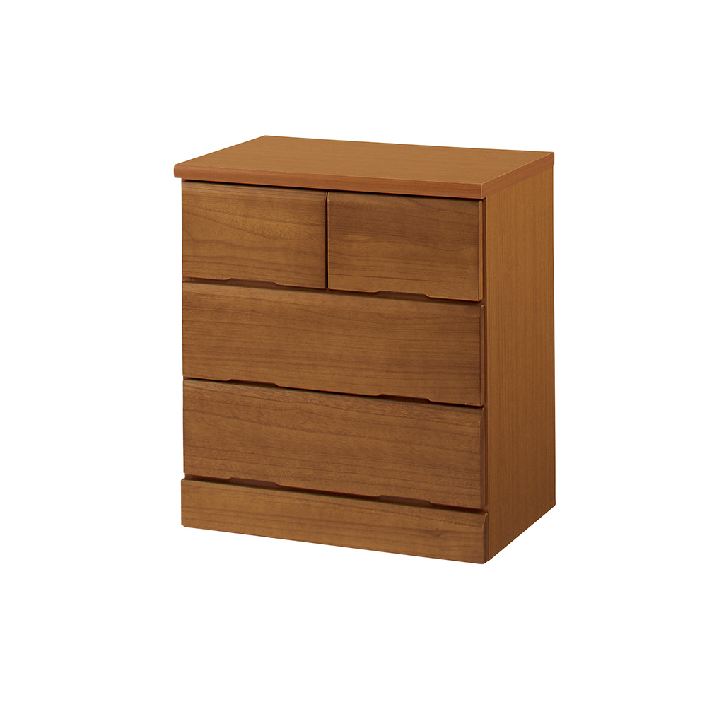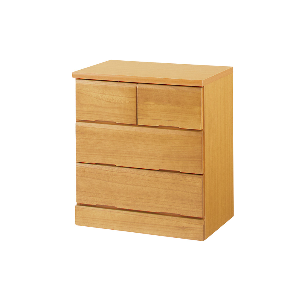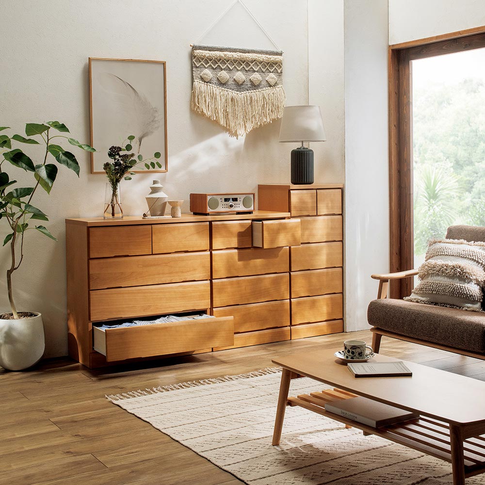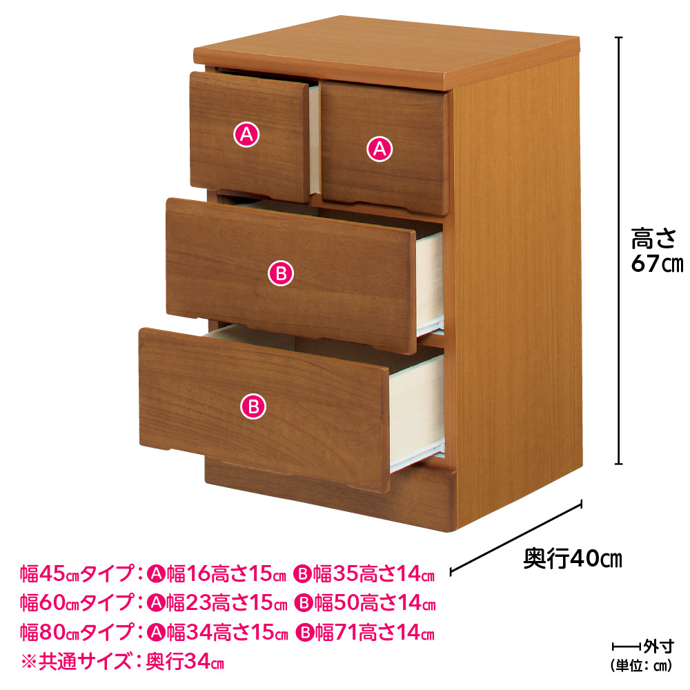 天然木を使った国産品、しかも組立不要の完成品チェストを驚きの価格で!収納を増やしたい。衣装ケースは部屋に置きたくない。リビングにチェストがほしい。あまり予算をかけたくない。家具の組立は苦手。まるっとおまかせです。天然木の国産完成品ながら驚きのハイコスパ!(ア)ナチュラル 写真左から4段・幅80cm、4段・幅60cm、5段・幅45cmタイプクローゼットや押し入れにチェストをしまうと、ダブルアクションになって面倒だし家族が自分で出し入れしにくい。もっと手近なリビングにこそ収納があったら便利ですよね。天然木の国産品なのに低予算、衣装ケースのように豊富なサイズ展開、組立要らずの完成品。かゆいところに手が届くチェストです。どんなインテリアにも溶け込むデザイン(イ)ブラウン 写真左から4段・幅45cm、3段・幅60cm、3段・幅80cmタイプさりげない上質感はリビングにもおすすめ。スペースに合わせて豊富なサイズから選べます。本体奥行40cmは、たっぷりの収納量を確保しながら圧迫感なく置ける絶妙なサイズ感です。家族で毎日使うチェストとしても(ア)ナチュラル 写真左から5段・幅60cm、5段・幅80cmタイプお子さまにも優しい手ざわりと機能性。お片づけの習慣づけにもぴったりのチェストです。転倒防止金具付きで安心です。3段タイプはナイトテーブルとしても(イ)ブラウン 写真は3段・幅45cmタイプ寝室でナイトテーブル代わりにも。おやすみ前に読みたい本やメガネなど、ちょっとしたものが収納できて便利です。幅3タイプ高さ3タイプから選べる豊富なサイズ展開(ア)ナチュラルサイズが豊富に選べる天然木レール付きチェストシリーズは、幅は45cm・60cm・80cmの3タイプ。高さは3段(67cm)・4段(85cm)・5段(103cm)の3タイプ、色はナチュラルとブラウンの2色展開で、お部屋に合わせてお選びいただけます。国内メーカーが丁寧に仕上げて完成品でお届けしますので、届いたらすぐお使いいただけます。小引き出しは整理しやすい仕切り付き(ア)ナチュラル最上段の小引き出しには小分けの仕切り付きで、下着や靴下など細々した物を整頓しながら収納できます。 ※仕切りは取り外せます。スライドレール付きで開閉がスムーズ(イ)ブラウン大引き出しはスライドレール付き。たっぷり収納してもなめらかに開閉できます。お子さまからご年配の方までどなたにもストレスなくお使いいただけます。大引き出し1杯の収納目安(幅45cm・60cmタイプ)写真左:幅45cmタイプ 写真右:幅60cmタイプ幅45cmは服1列(約5着)+ゆとりのスペース、幅60mは服2列(約10着)が収納の目安です。シャツや薄手のカットソー等を収納して検証しています。大引き出し1杯の収納目安(幅80cmタイプ)写真は幅80cmタイプ幅80cmは服3列(約15着)が収納の目安です。シャツや薄手のカットソー等を収納して検証しています。桐天然木のやわらかな木肌感写真左:(ア)ナチュラル 写真右:(イ)ブラウン引き出し前板には、着物箪笥などで古来から愛されている桐天然木を使い、キズや汚れがつきにくいようウレタン樹脂塗装を施しました。ぬくもりを感じる素材感を生かし、引き出し上部に丸みをもたせて肌当たり優しく仕上げました。