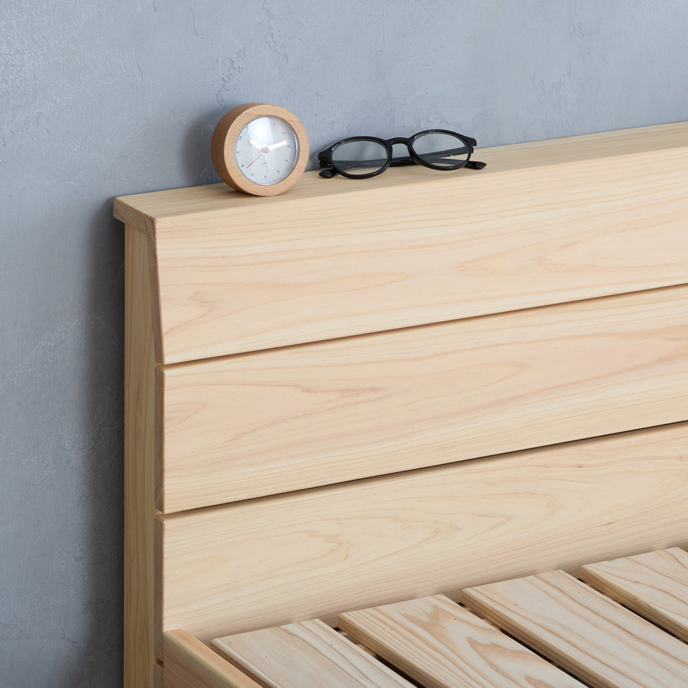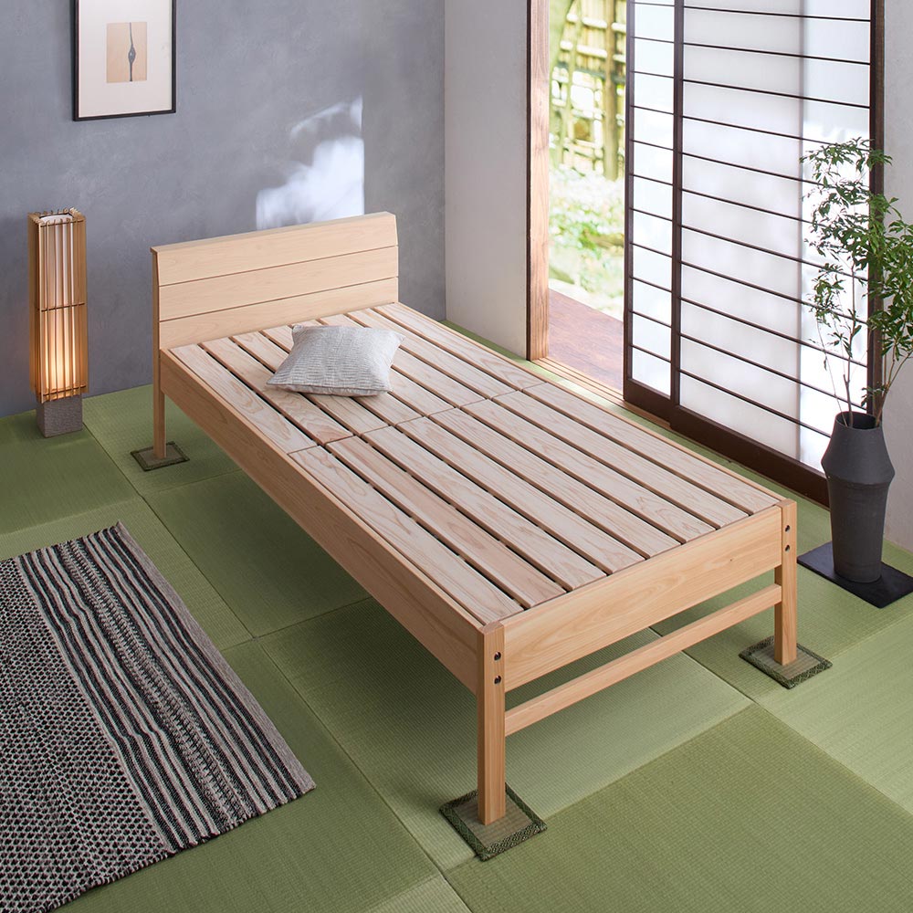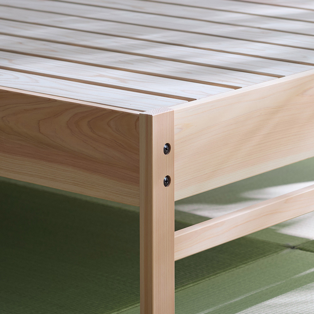フレームのヒノキ、床面のスノコは九州の山々から間伐した木材を使用しており、塗料・接着剤もF☆☆☆☆基準のものを使用しているので安心。 ※写真はセミダブルタイプです。