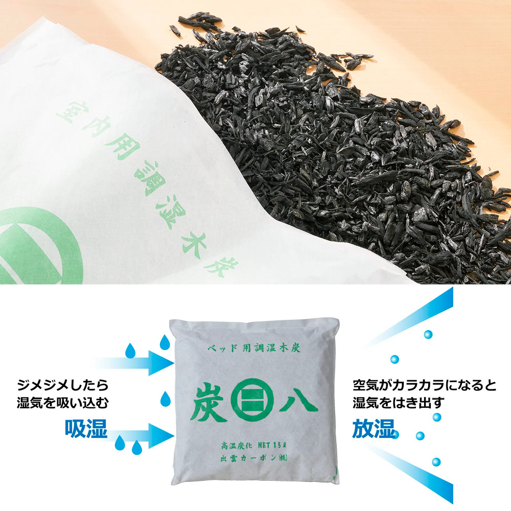 ベッド専用の炭八15リットル計8個付きで、床板の真下に敷き詰めることができます。薬剤不使用、交換も不要で長く使えます。