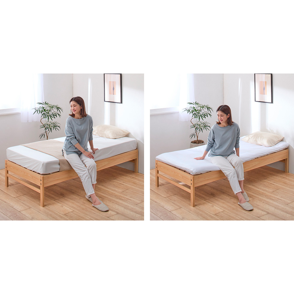 (写真左)敷布団(写真右)マットレス 敷布団でも、薄めのマットレスでも立ち座りが楽な高さ。敷布団で毎朝の起き上りがつらくなってきた方にもおすすめです。 ※写真は別売りのシングル・ヘッドなしタイプです。