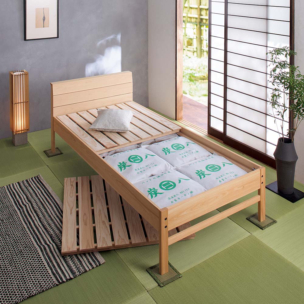 湿気対策で大人気の「出雲屋 炭八」コラボ国産ベッドが登場。 ※写真はシングルタイプ・ベッド専用炭八15リットル8個付きです。