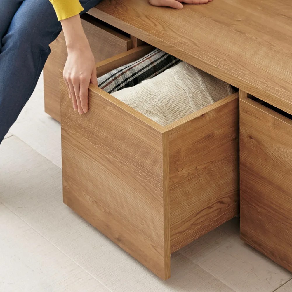 使用イメージ(ア)ブラウン 左からベンチ幅79cmタイプ、シェルフ高さ110cmタイプ。座ったまま取り出しやすい高さです。かわいらしいコンパクト設計。
