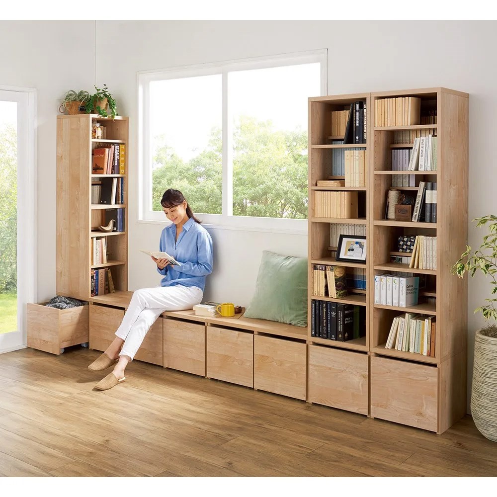 ベンチでゆったり休日の読書は公園気分で。窓辺で木漏れ日を感じながら読書。木目調がくつろぎを演出。好みの向きにカスタムできるシェルフやワゴン収納、前後段違い棚板など、機能も充実。使用イメージ(ナチュラル 左からシェルフ高さ180cm、ベンチ幅117cm、シェルフ高さ180cm×2)※お届けはシェルフ高さ180cmです天然木調シェルフで、ほっと安らぐ読書タイム収納量や向きをカスタムできる、天然木調ブックシェルフです。お天気のいい日に、日差しの降り注ぐ公園のベンチで読書がしたい…という本好きの方に向けて企画しました。ベンチに座りながらラクに本を探し読みできます。左:ブラウン正面 中央:ナチュラル正面 右:ナチュラル背面 高さ180cm(お届け商品のサイズ)大量収納が叶う高さ180cmタイプシェルフは高さ110cm、高さ180cmの2タイプ。背面化粧で美しい仕上げなので、壁から離して間仕切りとしても使用できます。コーディネート例(ブラウン 左:ベンチ幅79cm、右:シェルフ高さ110cm)※お届けはシェルフ高さ180cmですベンチと組み合わせて、居心地の良さと機能性がアップ!シリーズ品のベンチ(幅79cm、幅117cm)と組み合わせて使用できます。本棚とベンチの組み合わせで機能性が増し、たっぷり収納とくつろぎ空間が叶います。コーディネート例(ナチュラル 左:ベンチ幅79cm、右:シェルフ高さ110cm)※お届けはシェルフ高さ180cmですトレンド感のある北欧デザイン北欧風インテリアや植物との相性もぴったりな木目柄。置くだけで、スカンジナビア調のおしゃれなお部屋に!北欧風インテリアや植物との相性もぴったり。天然木調で開放感のあるおしゃれさも人気です。色はブラウン、ナチュラルの2色展開。コーディネート例(左:奥行内寸38cm※棚を揃えた状態 右:奥行内寸19cm※前後段違い)前後段違い棚で、文庫本からレコードまで対応!3cmピッチの可動棚板は、たわみにくい頑丈仕様。棚をそろえて使用すればゆったり収納、前後段違いにすれば文庫本やコミック、雑誌、レコードまで様々なサイズに対応。コーディネート例(ブラウン シェルフ高さ180cm×2)シェルフを並べて大容量ディスプレイラックにも2台並べて設置すれば、お気に入りの本や雑貨を収納するディスプレイラックに!テレビ台の横のキャビネットにも最適です。コーディネート例(ブラウン シェルフ高さ180cm)正面にも左右にも組み替えられるブックシェルフシェルフ上部のオープン部分は、正面にも左右にも組み替えOK!お好みの向きに設置できます。ワゴン内寸サイズ:幅31.4cm、奥行33cm、高さ30cm(ベンチと共通サイズ)座ったまま出し入れできる、キャスター付ワゴン最下段の隠しキャスター付ワゴンで、シリーズ品のベンチに座ったままの出し入れも簡単。移動もお掃除もスムーズです。高さがあるので雑誌を立てて収納したり、小物やおもちゃ収納にも最適。4か所のジョイントで安定感があります地震対策に!転倒防止金具付き