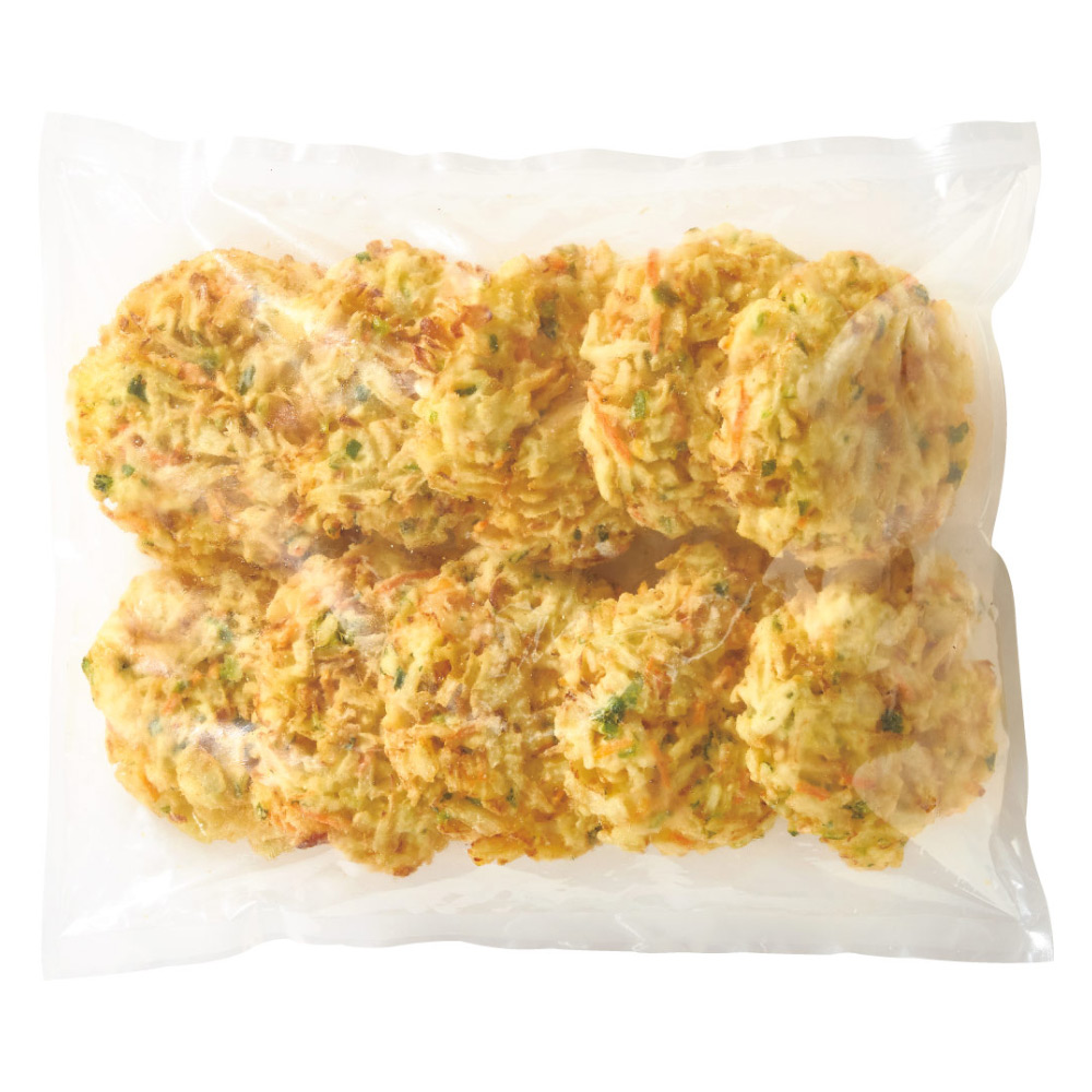 国産野菜たっぷり!手揚げのおいしさを温めるだけで味わえます。国産の野菜を使用し、ひとつひとつふんわりと手揚げで揚げたかき揚げです。かき揚げを温めて、おかずや麺類のトッピングとしてご利用ください。