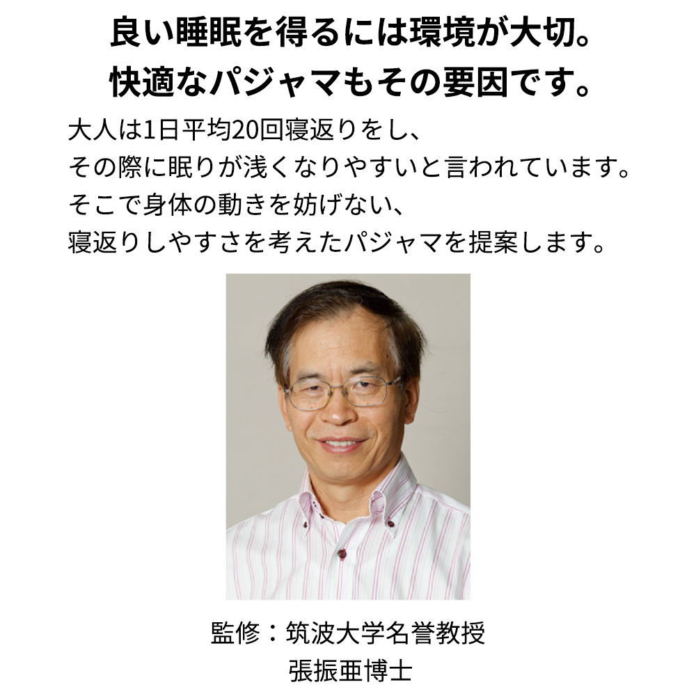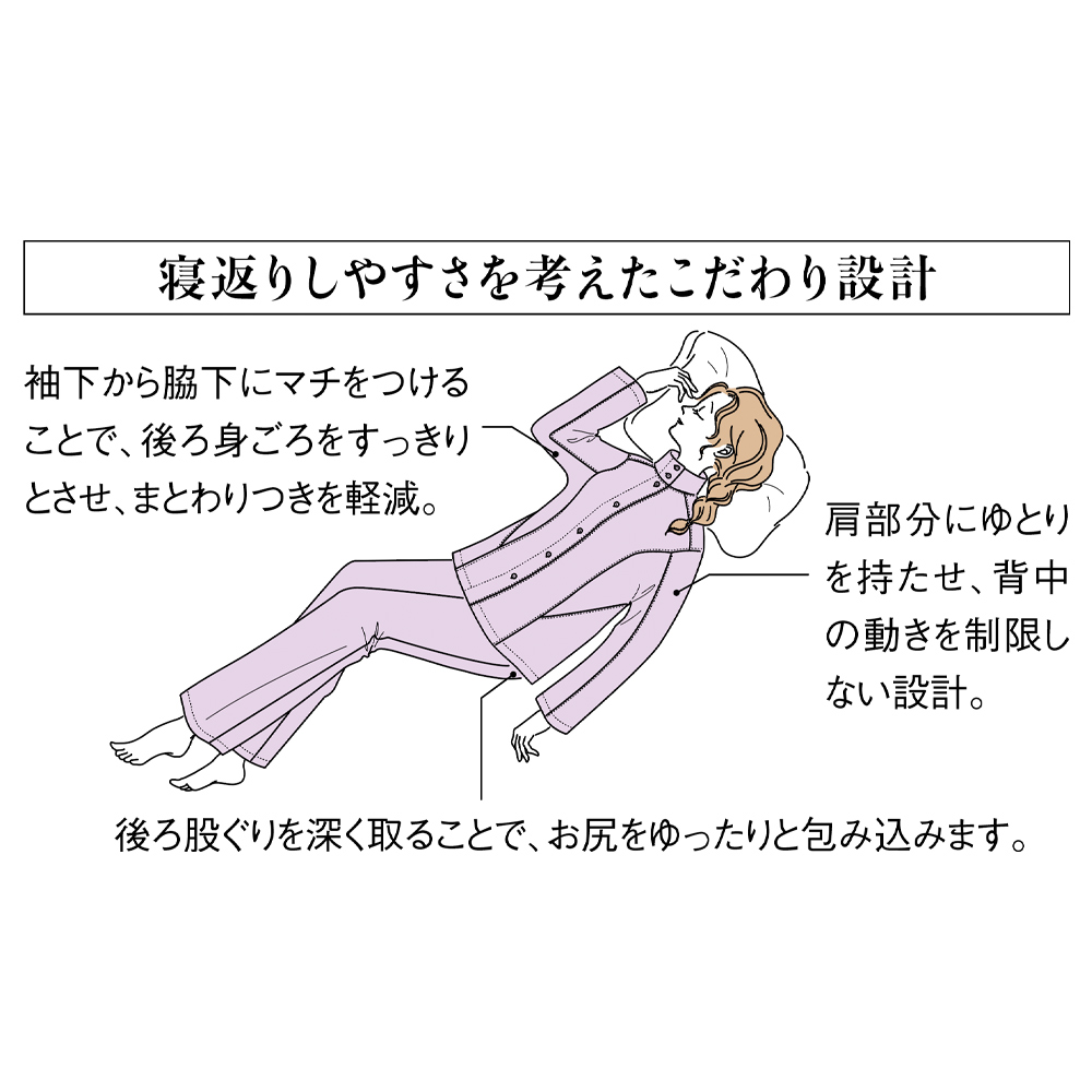 睡眠中こそ動きやすく!身体の形状や動きを考えた立体パターンの快眠設計で爽快な朝を。冬にうれしい三重ガーゼの肌面はピーチ起毛でふわりとあたたかな肌ざわりに仕上げました。快眠設計のパジャマで、浅くなりがちな大人の睡眠をサポート身体の形状や睡眠中の動きを考えた立体パターンにより、快眠にとって重要な寝返りをスムーズにすることを目指したパジャマです。睡眠中こそ動きやすさにこだわることで、眠りを妨げにくく。爽快な目覚めへと導きます。綿100%ガーゼを使い、独自のパターンで仕立てました洗うほどやわらかく肌に馴染む、ふんわりとした綿100%の三重ガーゼを使用。着心地はゆったりしているのに大きすぎないこだわりの立体パターンにより、睡眠中の動きについてくる快適な着心地に仕上げました。(イ)ベリーピンク寝返りしやすさを考えたこだわりの設計トップスは肩まわりにゆとりを持たせて動きやすく、なおかつ背中を丸めても突っ張りにくいすっきりとした設計。パンツはおしりの丸みやひざの動きを考え、パターンや縫い目の位置にまでこだわって仕上げましたゆとりのある着心地かつ、身体に沿う特別なパターン袖下から脇下にかけてマチを作ることで、後ろ身頃をすっきりさせてまとわりつき感を軽減しました。寝返りした際にも、生地がもたついたり引っ張られたりしにくく快適です。ヒップをゆったり包み、足を曲げ伸ばししやすいパンツパンツは後ろ股ぐりを深く取ることでお尻をゆったり包みこんで突っ張りにくく、丸まって眠るのが好きな方も快適です。おしゃれで暖かい、2WAY仕様の衿元衿を立てると首元まで暖かく、ほどよいゆとりで締め付け感なく快適です。ボタンを外して、衿を寝かせても着られます。肌面をふんわりと起毛した綿100%の三重ガーゼ生地綿100%の三重ガーゼ生地の肌面を起毛しているので、ふんわり暖かくやわらかな肌あたり。ガーゼ素材なので洗うほどに柔らかくふっくらと育ちます。