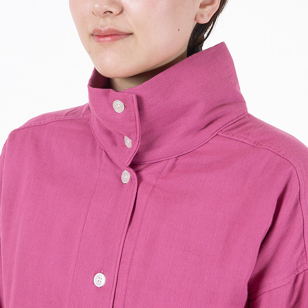 (イ)ベリーピンク 衿を立てると首元まであたたか。ボタンを外して、襟のように寝かせても使うことができます。