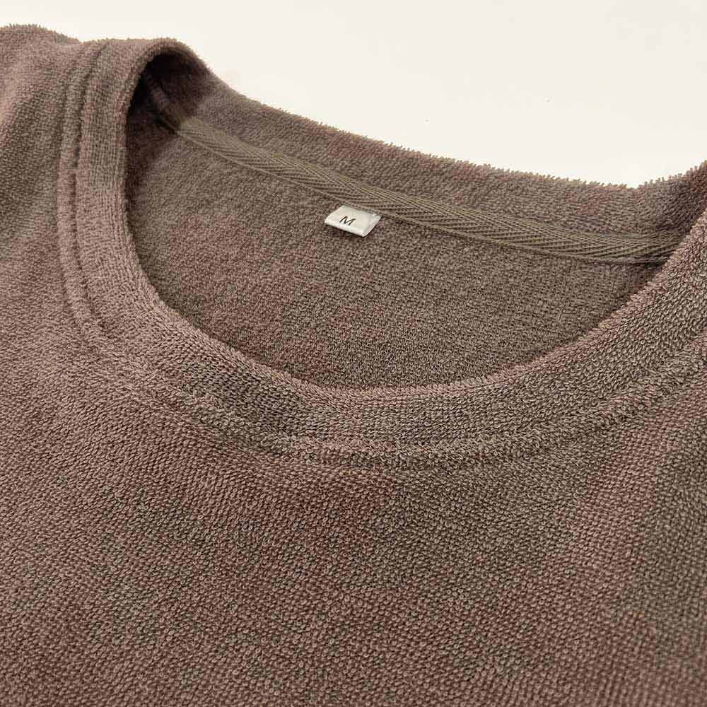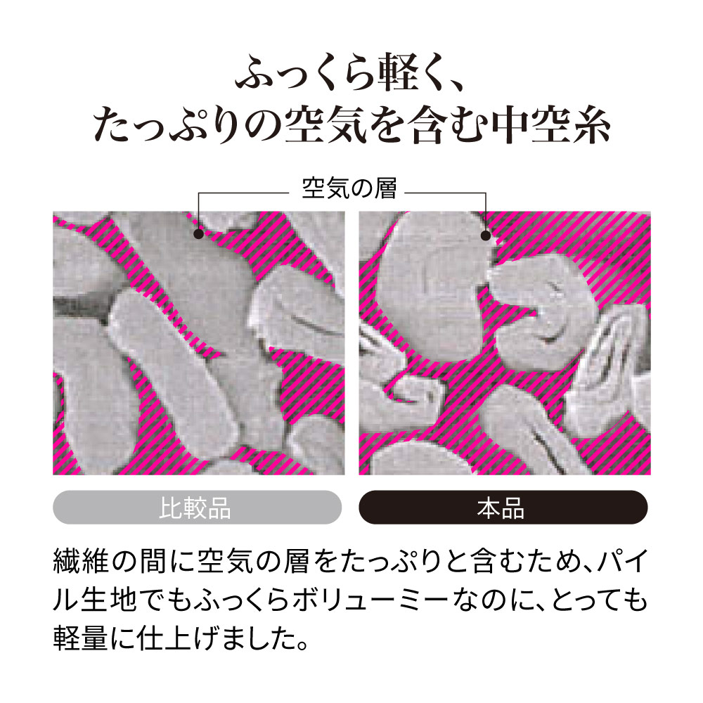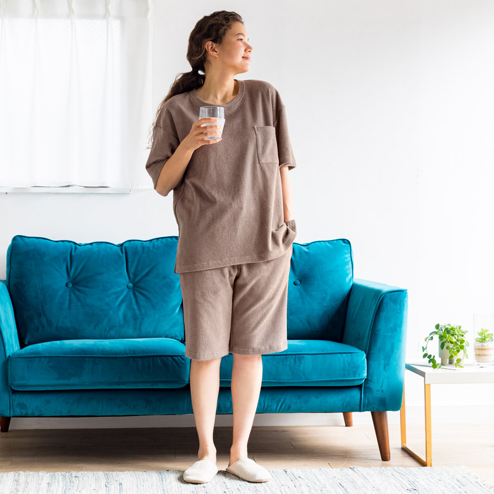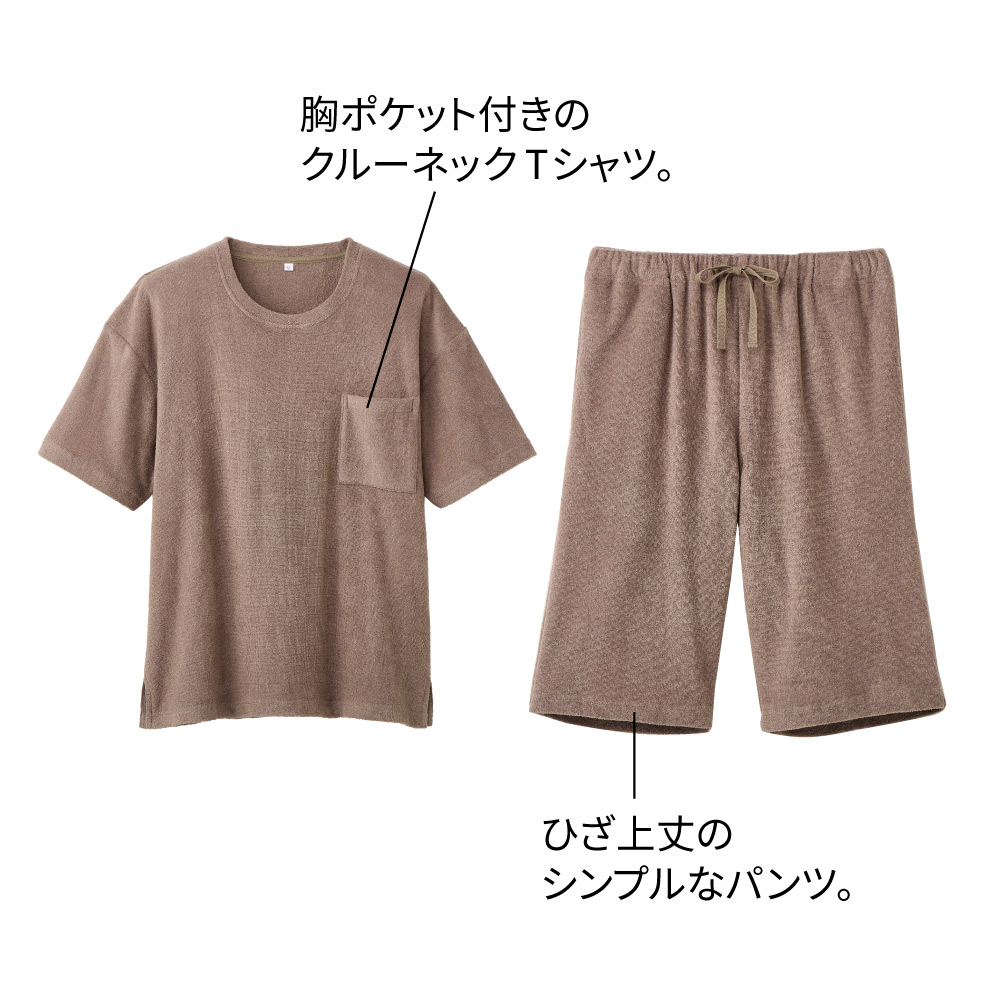 密度の高いパイル地でありながら、中空糸を使うことで驚きの軽さと涼しさ、さらに吸水・速乾性を実現。ふんわりさっぱりとしたパイルの気持ちよさを、真夏も味わえるパジャマです。湯上がりにすぐ着てもサラリとして汗もどりしにくく、バスローブ感覚の快適さ。洗濯後の乾きが早いのもうれしい!女性にもご着用いただけるジェンダーレスなデザインです。驚きの軽さと吸汗性!やわらかなタオルに全身包まれて眠るしあわせ。密度の高いパイル地でありながら、中空糸を使うことで驚きの軽さと涼しさ、さらに吸水・速乾性を実現。ふんわりさっぱりとしたパイルの気持ちよさを、真夏も味わえるパジャマです。湯上がりにすぐ着てもサラリとして汗もどりしにくく、バスローブ感覚の快適さ。洗濯後の乾きが早いのもうれしい!女性にもご着用いただけるジェンダーレスなデザインです。ふんわり軽く・やわらかく・ドライな両面パイル。密度の高いしっかりとしたパイル生地。中空糸を使用することで空気を含んでふんわりと軽く、汗や湿気を素早く吸収・発散します。タオルの気持ちよさと、軽やかな涼しさを同時に味わえる生地です。同生地のレディースパジャマも。同生地のデザイン違いでメンズ用・レディース用をご用意。お得なセット価格をご用意。お好きな2点をお選びいただけます。洗い替え用の2着セットや、メンズ・レディースのペアセットもおすすめです。