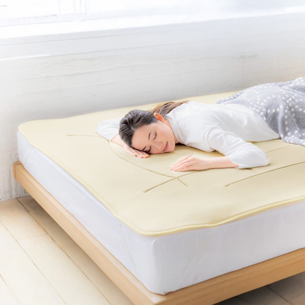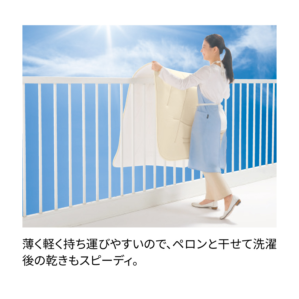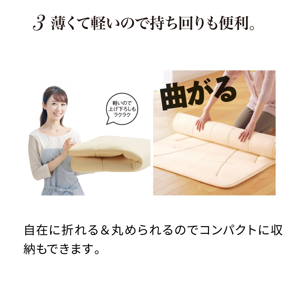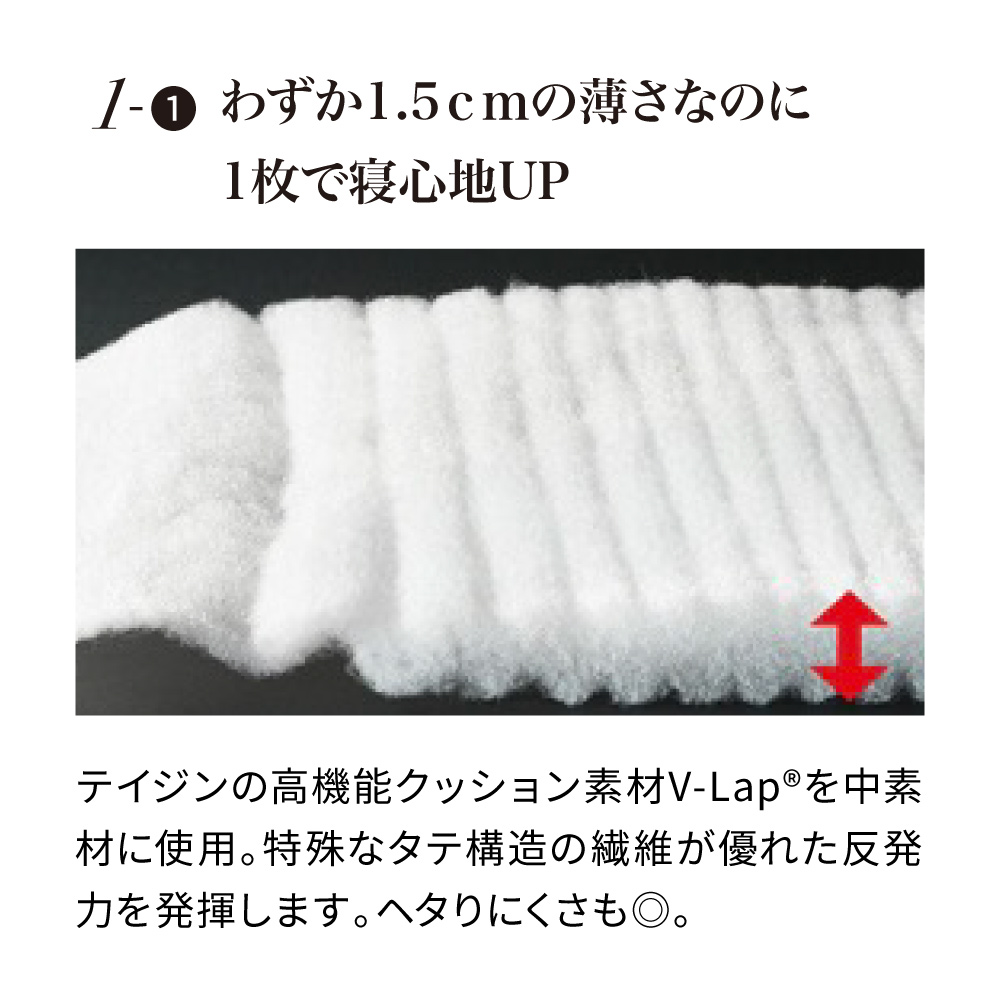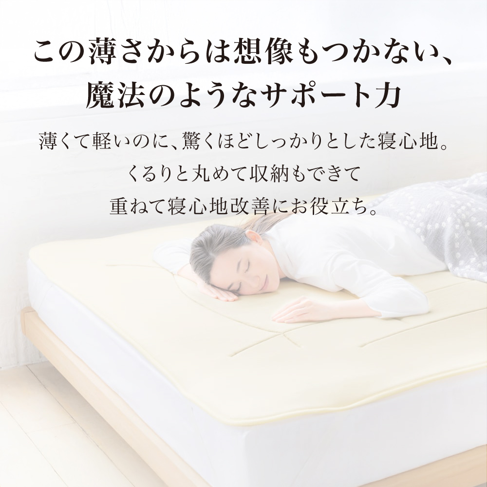 厚み約1.5cmという薄さでありがなら、お使いの敷き布団やマットレスの寝心地を魔法のようにアップしてくれる敷きマット。秘密はタテ型繊維の中芯・テイジンの「V-Lap(R)」が、身体を下からしっかり押し上げてくれるから。薄く軽いので扱いやすく、くるくる丸めて収納もOK。この薄さからは想像もつかない、魔法のようなサポート力薄くて軽いのに、驚くほどしっかりとした寝心地。お使いのマットレスや敷き布団の寝心地を魔法のようにアップしてくれる敷きマットです。くるりと丸めて収納にも場所を取りません。わずか1.5cmの厚みで寝心地しっかりテイジンの高機能クッション素材V-Lap(R)を中素材に使用。特殊なタテ構造の繊維が優れた反発力を発揮します。ヘタりにくさも◎。腰を支えられなくなったマットレスや、ふかふか感を失った敷布団も、この敷きマット1枚をサッと重ねて4隅ゴムで留めるだけで寝心地UP!!V-Lap(R)は薄くてもパワフルにサポート各素材の上にウエイトを置いて比較。ポリエステルわたが沈み込むのに対し、V-Lapは優れた反発力で沈み込みにくく、しっかりと押し上げているのが分かります。薄くても身体の負担をしっかり軽減!本品を1枚敷くだけで負担の集中を示す赤い部分が減り、全身をバランスよく支えていることが分かります。※スプリングマットレスの上に仰向けになり本品(敷きマット)使用時と未使用時を測定。男性被験者(176cm、68kg)、個人差があります。ルナール調べ優れた通気性でムレにくく爽やか中素材のV-lap(R)は水を簡単に通すほど通気性が良く、さらに側地は立体メッシュを採用しているので、熱や湿気がこもりにくく爽やか。夏はムレを防ぎ、冬は結露対策にも◎。季節を問わずご使用いただけます。薄くて軽いので持ち回りも便利自在に折れる&丸められるのでコンパクトに収納もでき、必要な時すぐにサッと広げて使えます。丸洗いできていつでも清潔ご家庭の洗濯機で丸洗いでき、気持ちよくお使いいただけます。(洗濯ネット使用)薄く軽く持ち運びやすいので、ペロンと干せて洗濯後の乾きもスピーディ。お好みで選べる2タイプの側生地綿100%で肌あたりのやわらかなスムースニットタイプと、通気性に優れサラリと快適なメッシュタイプからお選びいただけます。電動ベッドにオススメ!どんな動きにも自在に対応敷き布団やマットレスに重ねてお使いいただけることはもちろん、リクライニングなどの動きにも自在に対応し、丸洗いもできるので、マットレスを交換できない電動ベッドにもオススメです。※介護用電動ベッドにお使いになる場合は、取扱説明書等をよくご確認の上ご使用ください。