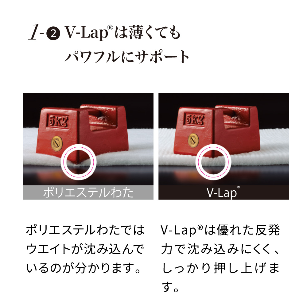 [敷布団・専用カバー付き]厚み約3cmという薄さでありながら、タテ型繊維の中芯・テイジンの「V-Lap(R)」が身体を下からしっかり押し上げて体圧分散するから、床に直敷きしても快適。お使いの寝具に重ねて寝心地の復活にも◎。肌ざわりの良い綿100%ニットの専用カバーは、ご自宅で洗えて清潔に保てます。この薄さからは想像もつかない、魔法のようなサポート力薄くて軽いのに、驚くほどしっかりとした寝心地。くるりと丸めて収納もできて一枚でも、重ねて寝心地改善にもお役立ち。清潔にお使いいただける専用カバー付きセットです。肌あたりの良い綿100%の専用カバー付き!サイドファスナー付きで簡単に着脱でき、ご自宅の洗濯機で洗えて衛生的にお使いいただけます。わずか3cmの厚みで寝心地しっかりテイジンの高機能クッション素材V-Lap(R)を中素材に使用。特殊なタテ構造の繊維が優れた反発力を発揮します。ヘタりにくさも◎。V-Lap(R)は薄くてもパワフルにサポート各素材の上にウエイトを置いて比較。ポリエステルわたが沈み込むのに対し、V-Lapは優れた反発力で沈み込みにくく、しっかりと押し上げているのが分かります。驚きの薄さなのに快適な寝心地従来の敷き布団と比較してもこの薄さ!なおかつ床に直接敷いてもしっかりとした快適な寝心地です。優れた通気性でムレにくく爽やか中素材のV-Lap(R)は水を簡単に通すほど通気性が良く、さらに側地は立体メッシュを採用しているので、熱や湿気がこもりにくく爽やか。夏はムレを防ぎ、冬は結露対策にも◎。季節を問わずご使用いただけます。シングルサイズでわずか2.5kgと超軽量片手でもラクラク持てる軽さだから、上げ下ろしやお手入れもストレスフリー。薄く軽く持ち運びやすいので、ペロンと干せて洗濯後の乾きもスピーディ。丸めて、たたんで、コンパクトに収納可能丸めて収納できるゴムバンド付き。3つ折りにしても場所を取らずに保管できるから、お客様用寝具としても重宝します。お使いの寝具の寝心地改善にも!へたったマットレスや敷き布団に重ねるだけで、寝心地アップ。お気に入りの寝具を捨てずに済むのもうれしい。お好みで選べる2タイプの側生地綿100%で肌あたりのやわらかなスムースニットタイプと、通気性に優れサラリと快適なメッシュタイプからお選びいただけます。