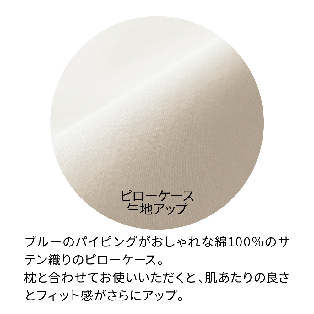 ビックシルエットで背中までフィットする、「ふんわりシンクロピロー」専用のピローケースです。綿100%のサテン織で肌ざわりが優しいのがポイント。柔らかいミルキーホワイトにブルーのパイピングをセレクトしたシンプルながらおしゃれなデザインです。ブルーのパイピングがおしゃれな綿100%のサテン織り。本体と合わせてお使いいただくと、肌あたりの良さとフィット感がさらにアップします。