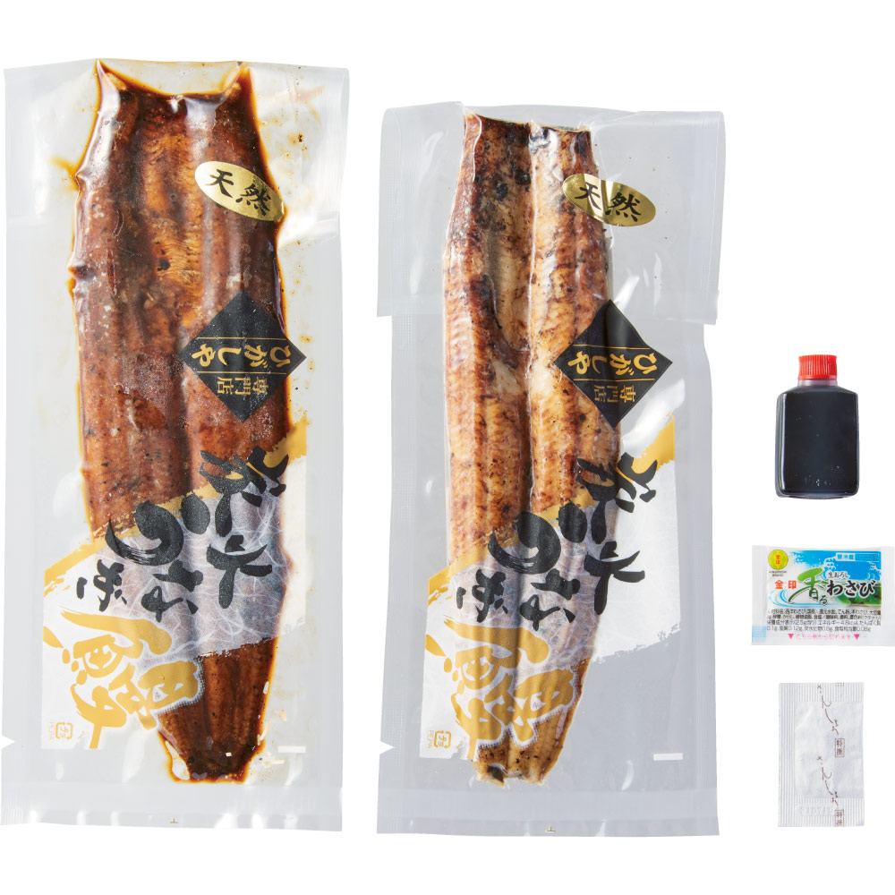 ※本商品は蒲焼き2枚になります。商品パッケージ(左)蒲焼 (右)白焼 ※わさびのパッケージが変更になります。(商品番号FJ0023〜FJ0024)