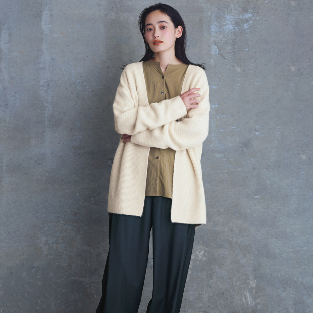 LUXURIOUS AND EFFORTLESSこだわりの素材、職人の技が光るディテール。ポリシーのあるアイテムは、着るだけで豊かな気持ちをもたらし、大人としての存在感を高めてくれるはず。ふんわりと柔らかなさわり心地にうっとりふくらみのあるウールとヘアリーなフォックスをブレンド。あたたかみをもたせた軽やかな表情で、ほかとは一線を画す風合いに。カジュアルに落とし込んで、リュクスなエッセンスを香らせて。さらりと羽織れる気軽さと、程よい厚み感を兼ね備えたコーディガン。着流しデザインでインナーを選ばず色々な着こなしに使えます。単品使いはもちろんのこと、共通素材のフーディストール(商品番号:121302)合わせもおすすめです。