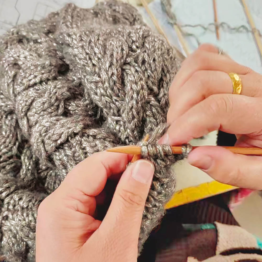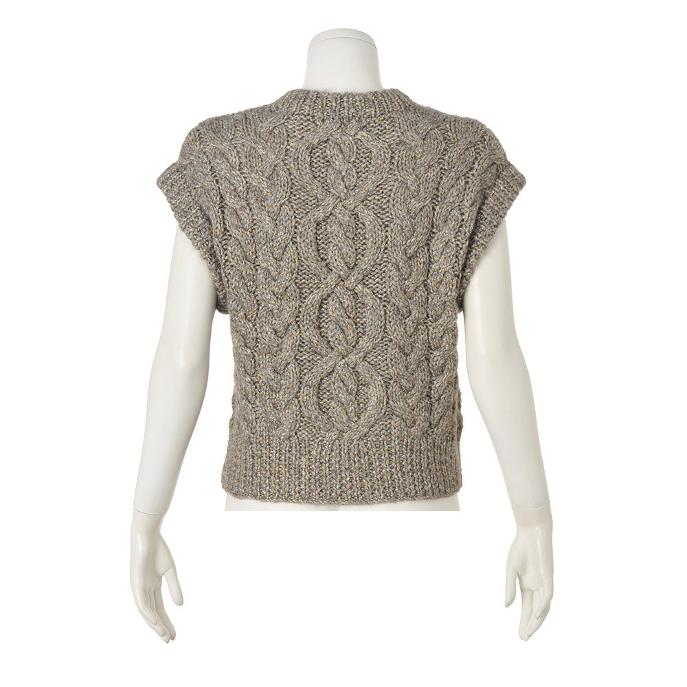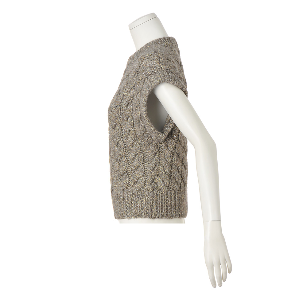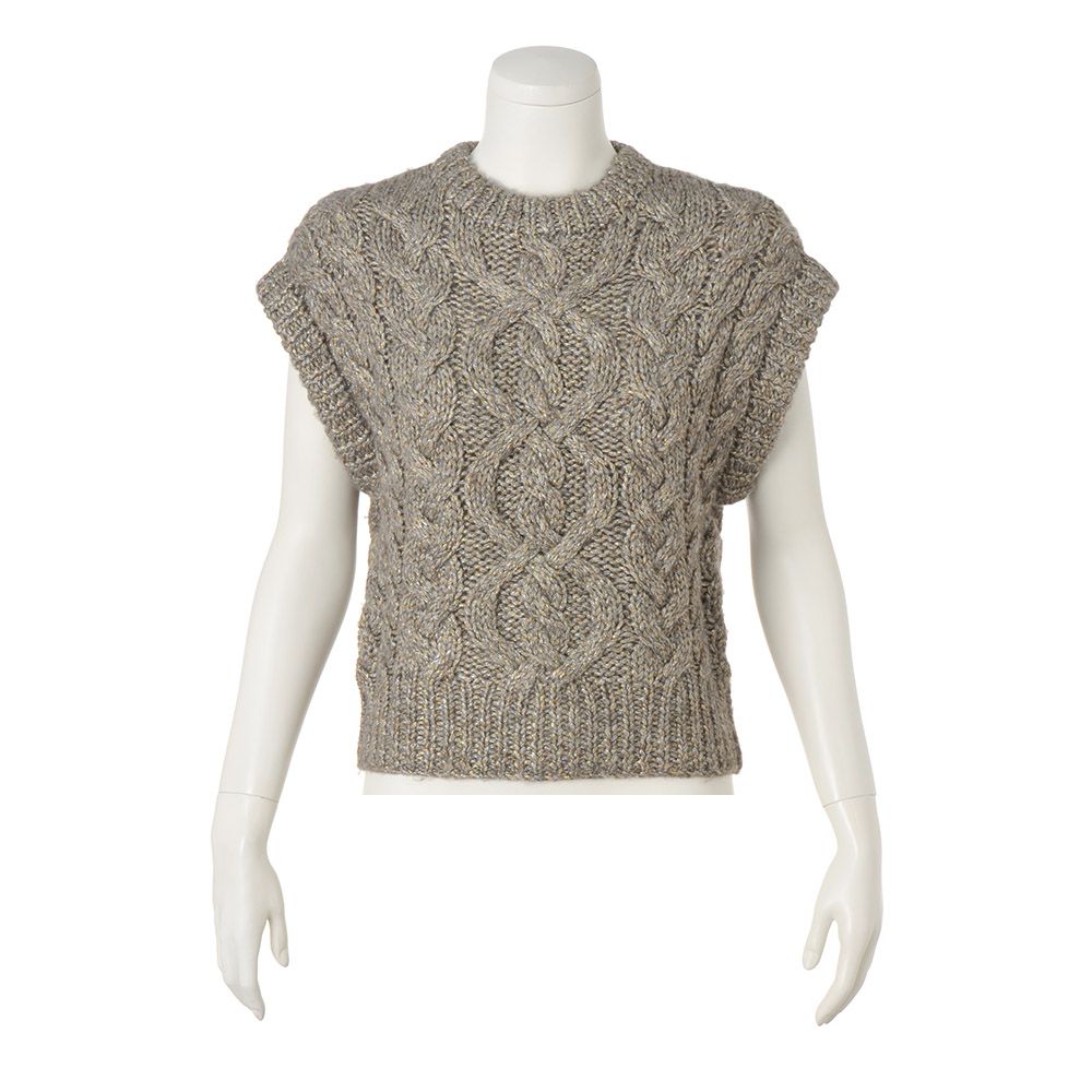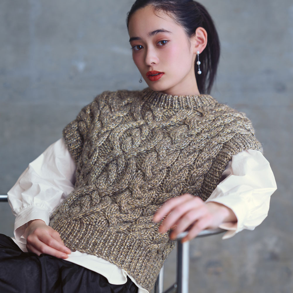 LUXURIOUS AND EFFORTLESSこだわりの素材、職人の技が光るディテール。ポリシーのあるアイテムは、着るだけで豊かな気持ちをもたらし、大人としての存在感を高めてくれるはず。ハンドメイドならではの立体感が魅力手編みでしか再現できないざっくりとしたケーブル柄をポイントにして、使い勝手のいいベストを作りました。ゴールドやシルバーのラメ糸をミックスして、煌めきをプラス。均一化された機械編みとは違い、一着ずつ糸を編むことで生まれる豊かな表情とぬくもりを楽しんで。立体感のあるケーブル編みが目をひくニットベスト。広めの肩幅デザイン&コンパクトな着丈感で、シャツやワンピースとのレイヤードもバランスよくキマります。いつもの着こなしに一着追加するだけでトレンドの表情に。