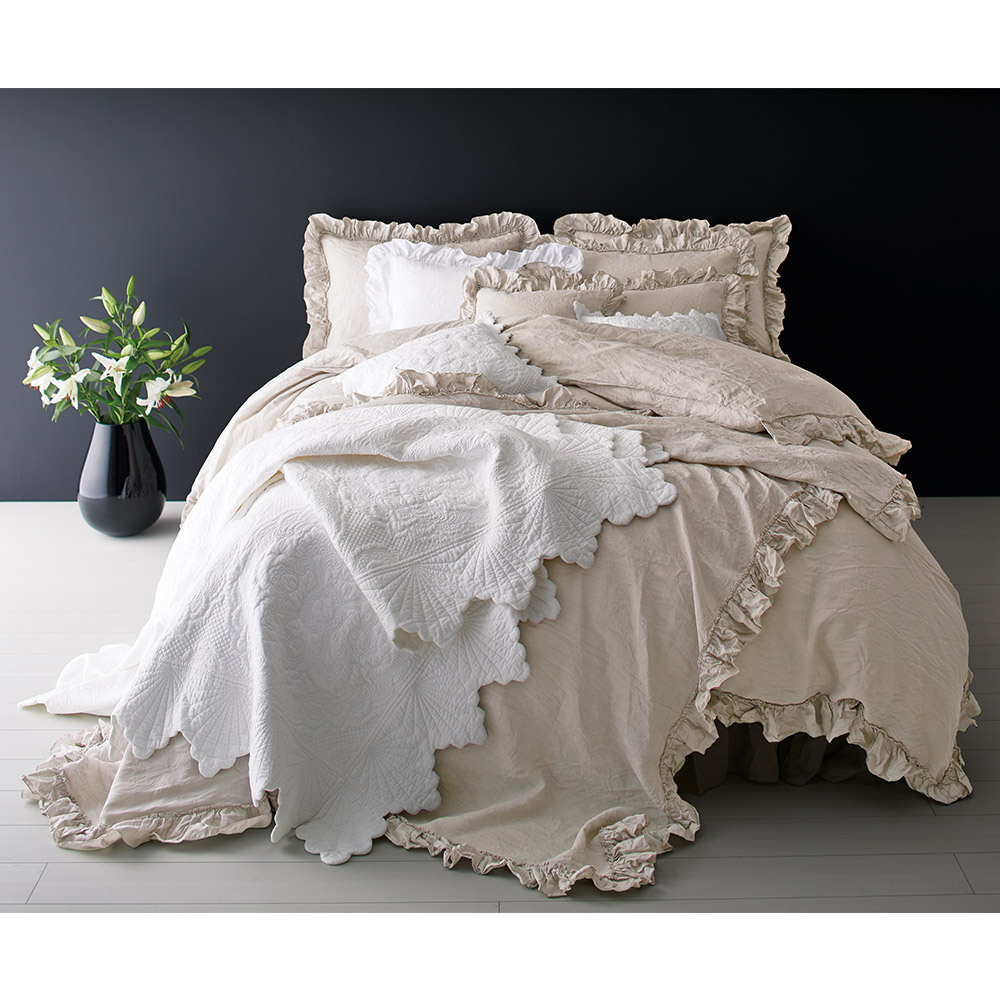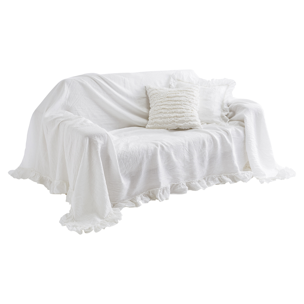 吸湿・速乾、触り心地に優れたフレンチリネン100%の贅沢なシリーズのマルチカバー。リネンは夏は涼しく、冬は暖か。そして洗うほどに柔らかくなる、肌触りの心地いい天然繊維です。細部のフリルまでリネンの生地を使った贅沢な仕様が人気のシリーズです。上質なフランス製の麻100%を原料とした細い糸を使用し、柔らかい肌触り。時を重ねて、洗うほどに柔らかくなるリネン(麻)。麻は、同じ天然繊維のコットンよりも少しだけ贅沢なイメージなのかもしれません。そんな麻の風合いが心まで豊かにしてくれるカバーリングシリーズです。洗うたびに柔らかな風合いに変化して、吸湿・速乾性に優れた繊維。夏は涼しく、冬はあたたか。しなやかな肌触りで一年中、ご愛用いただけます。今回は、細部のフリルまで、麻の生地を使った贅沢な仕様。 定番のベージュはグレイッシュなベージュにすることで甘さを抑え、フリルデザインでもシックな印象に。しなやかな肌触りと、優れた吸湿・速乾性で、リネン好きにはたまらないカバーリングシリーズです。また今回は広幅の生地を使うことで、約280×330cmのサイズ以外はすべて接ぎの入らない美しく贅沢な仕様となっております。しなやかな肌触りと、優れた吸湿・速乾性で、リネン好きにはたまらないカバーリングシリーズです。※風合いを出すために洗いざらしの状態で撮影しています。