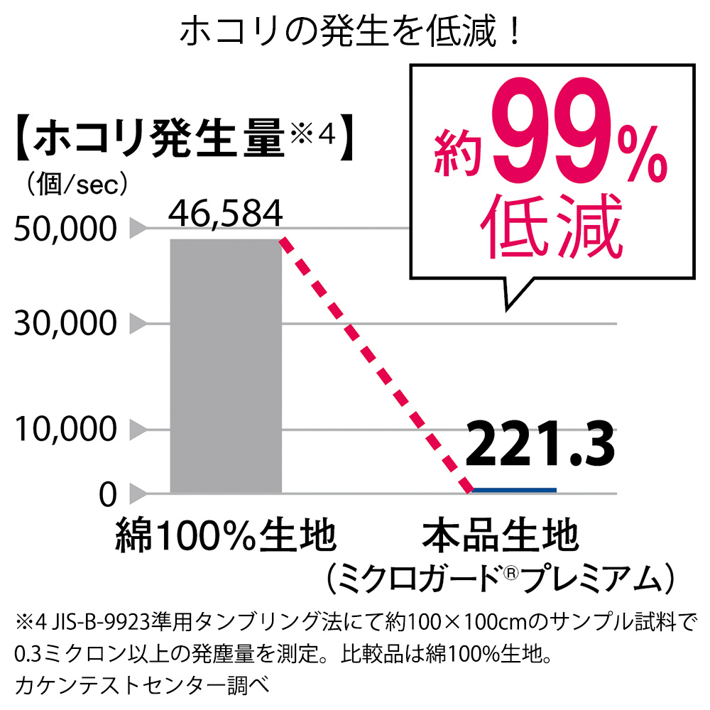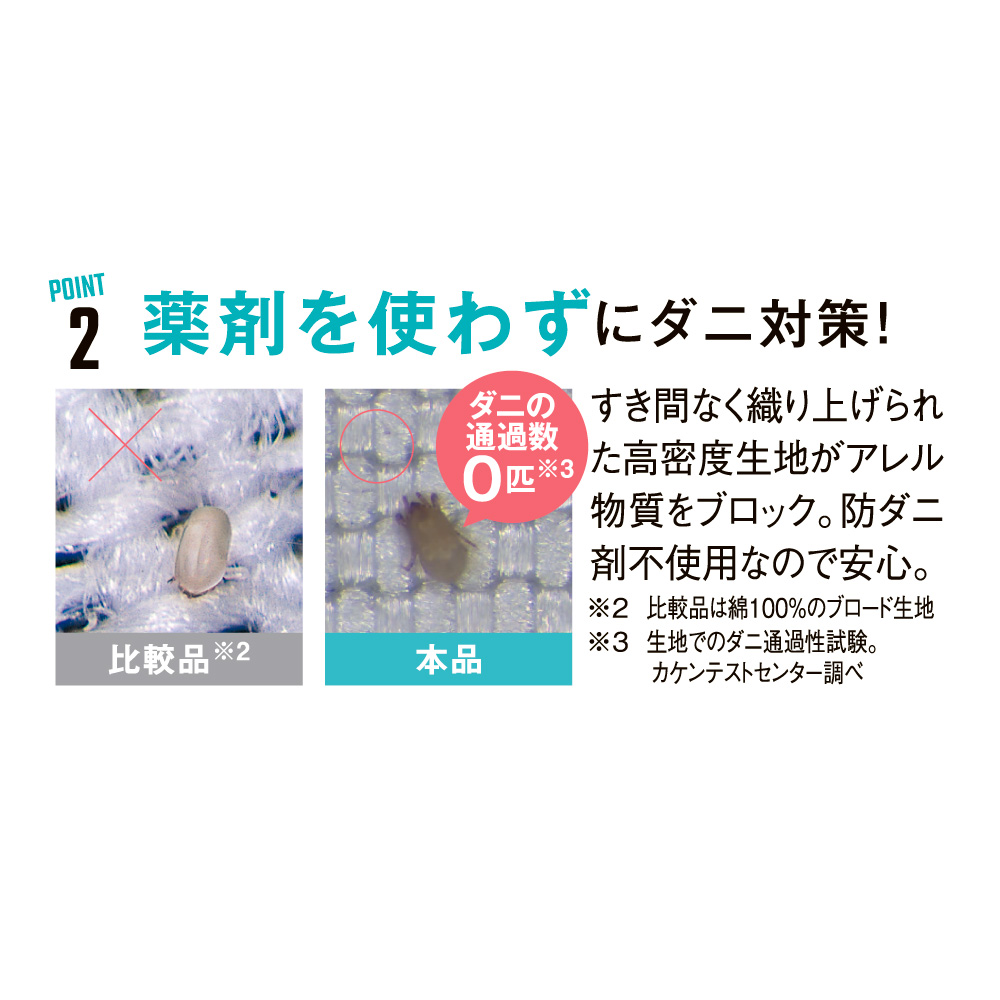 実感できるハウスダスト対策を!!テイジンの特殊技術で超極細繊維を高密度に織り上げたミクロガード(R)プレミアム。花粉、ホコリ、ダニ、さらにアレル物質まで徹底ブロック!ハウスダスト対策にお悩みの方から絶大な支持を受けるロングセラー商品ミクロガード(R)のプレミアムシリーズ!花粉もホコリもダニも強力にブロックして、家族の眠りを守ります。生地の風合いがなめらかなのもポイントです。目に見えないダニやホコリさえも、ブロック!布団のホコリ発生量を、約98%も減らします!※テイジンの独自技術で、超極細繊維をすき間なく織り上げた生地がホコリを徹底ブロック。朝起きた時や布団の上げ下ろしする時のホコリの心配がグッと減ります。寝室の掃除もラクになって一石二鳥!さらに、静電気防止糸を新たに採用。布団へのハウスダストの引き寄せも防ぎます。※0.3マイクロメートル以上の発塵量を測定。比較品のわた布団は、中綿:合繊、側地:綿100% カケンテストセンター調べ防ダニ剤なしで、ダニ対策できます側地には防ダニ剤を一切使わず、生地だけでダニを徹底ブロック!小さなお子様も安心です。「ミクロガード(R)プレミアム」はダニはもちろん、さらに微細なダニのフンや死骸さえも通しにくい生地です。綿の約2倍(※)の速乾力で、乾きがとっても早いミクロガード(R)プレミアムの生地に水分を含んでも、毛細管現象によりぐんぐん吸水し、素早く拡散。速乾力に優れているので、乾きにくい季節の洗濯も苦になりません。※ミクロガード(R)プレミアム生地での比較。ボーケン品質評価機構調べ透湿性アップでサラッと快適すき間のほとんどない高密度生地でも、湿気は外へスムーズに放出。布団の中のムレやべたつきを防ぎます。
