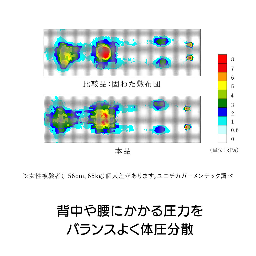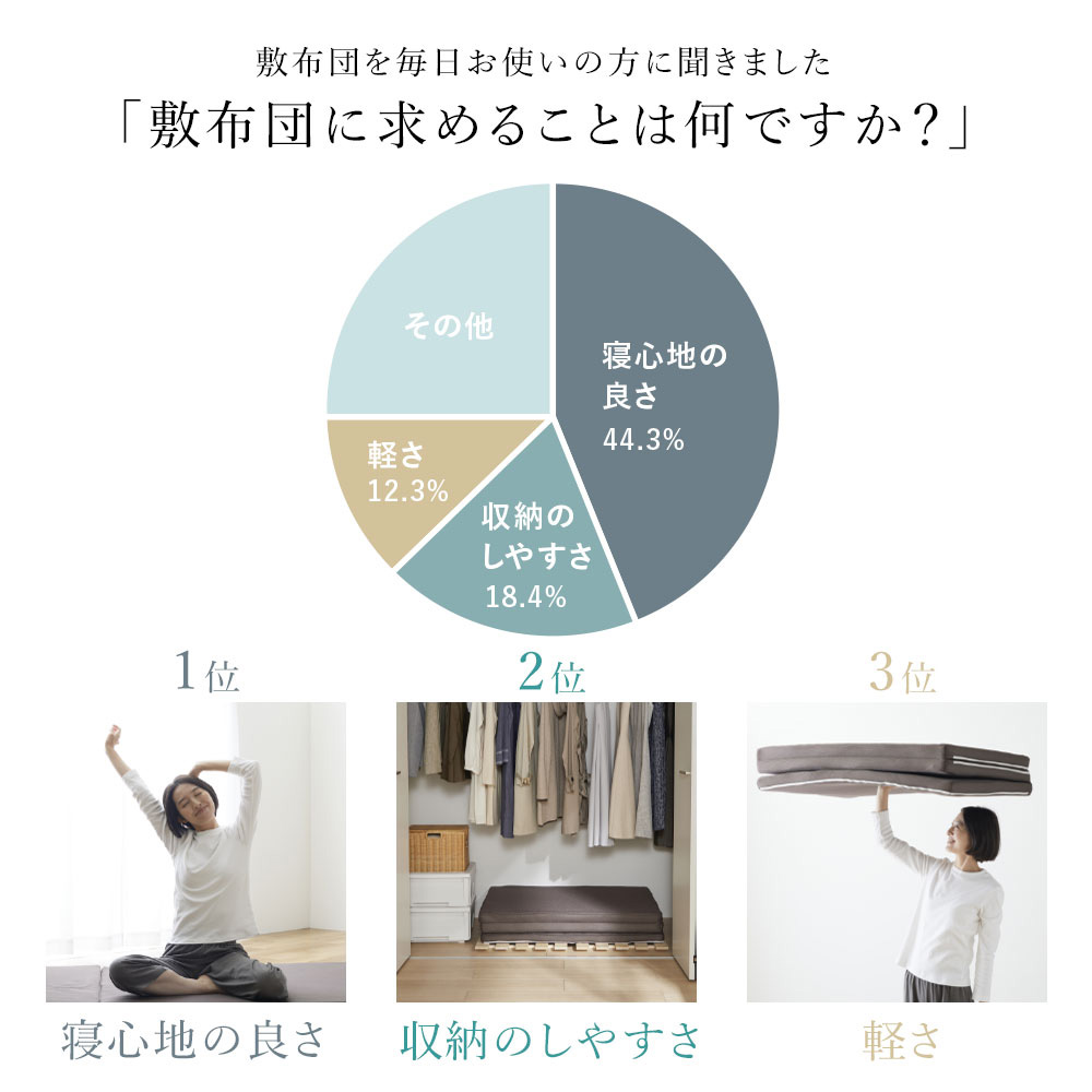 敷布団ユーザーへのアンケート結果をもとに理論、素材、技術、そしてお客様目線とそれぞれの分野における“日本の匠”たちが、知識と経験、熱い想いを持ち寄って「床に直接寝る人へ向けた敷布団」をつくりました。