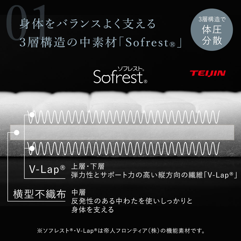 中素材はタテとヨコを組み合わせた3層構造のテイジン「ソフレスト®」を使用。1・3層目は縦型不織布の「V-Lap®」で肌当たりよくしっかりとフィットし、縦の力でサポート。2層目の横型不織布がしっかりと身体を支えて、自然な寝姿勢に導きます。