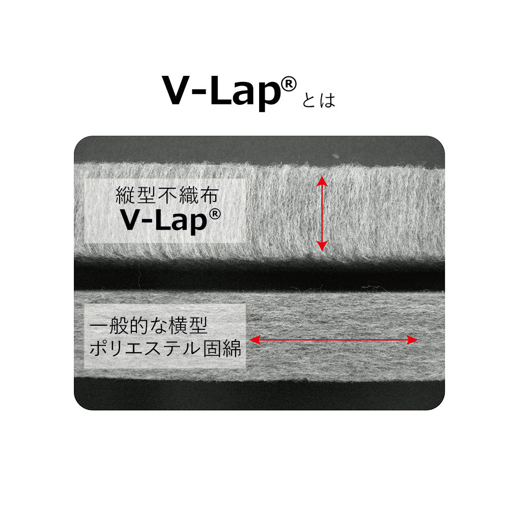 テイジンの特殊成形構造体「V-Lap®」。繊維がタテ方向に配列した不織布構造の「V-Lap®」は軽量・通気性と弾力を併せ持ち、身体をしっかりと支え、快適な寝心地をサポートします。