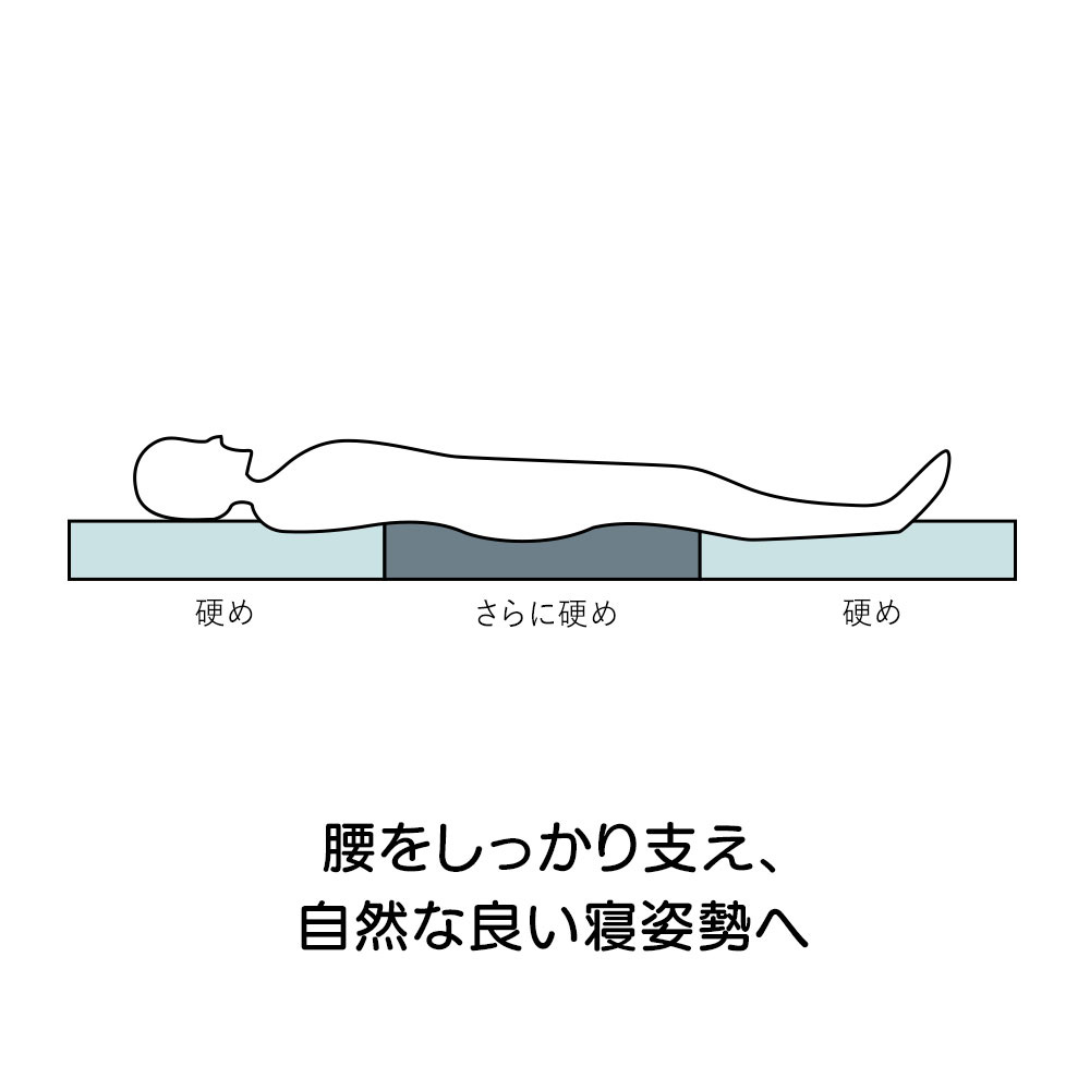 真ん中の中素材は頭・脚部分よりも固めにし、沈み込みやすい重い腰をしっかり支えるバランス設計に。2種類の硬さで腰を沈み込みにくくし、身体に負担の少ないまっすぐな寝姿勢に導きます。