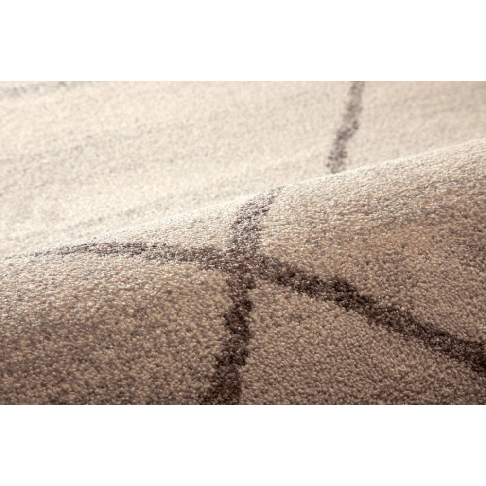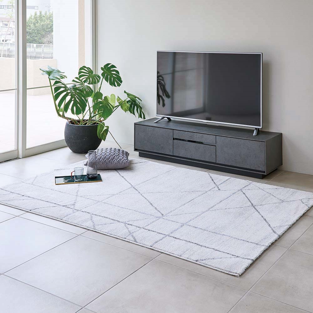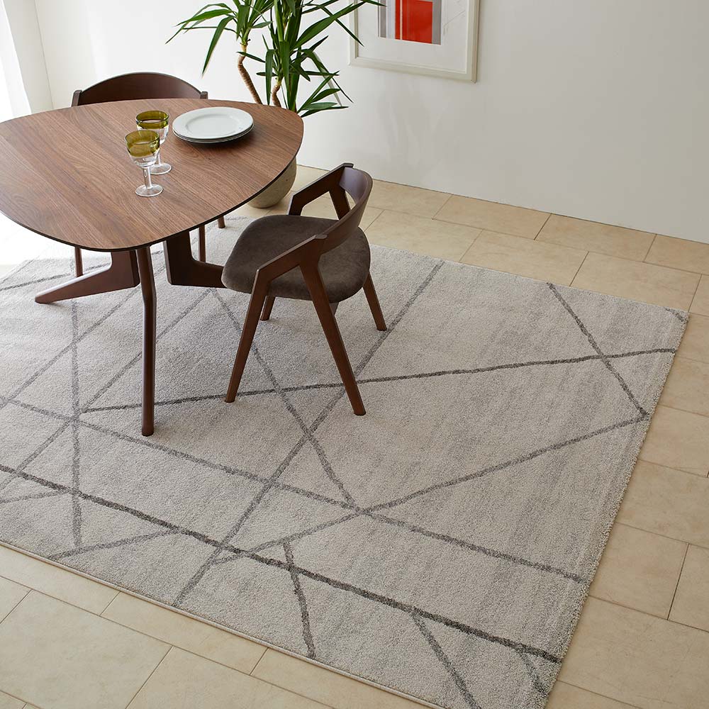 インテリアに馴染むシンプルモダンな雰囲気のウィルトン織ラグです。手書き風のラインが優しいニュアンスを醸し出し、ナチュラルにもモダンにも、シャビーなインテリアにもマッチするデザイン。ポリプロピレン糸を使用していますが、ポリエステルの様な柔らかさ、光沢があり、高級感の有る仕上がりになっています。インテリアに馴染むシンプルモダンな雰囲気のウィルトン織ラグです。手書き風のラインが優しいニュアンスを醸し出し、ナチュラルにもモダンにも、シャビーなインテリアにもマッチするデザイン。ポリプロピレン糸を使用していますが、ポリエステルの様な柔らかさ、光沢があり、高級感の有る仕上がりになっています。【素材】ポリプロピレンは耐久性に優れた軽い素材で、吸湿性がないので濡れても乾きやすく、その分お手入れがしやすい素材です。着色する場合は原料から染色するので堅牢度に優れ色落ちしにくいという特性も持っています。また他の素材に比べて遊び毛がほとんど出ないのも特徴です。【ウィルトン織り】18世紀中期に英国ウイルトン市で始まった機械織りの製法のことを言います。下糸にパイル糸を絡み合わせてつくる織物なので、下生地に糸を貼り付けるタフト製法のものよりも耐久性に優れ、汚れにも強いという特性を持っています。そもそもヨーロッパでは靴で上を歩くことを前提で作られているわけですから日常使いには十分な強度持っていると言えます。【ヒートセット加工】滑らかな肌触りのヒートセット加工。熱処理によりウールのように柔らかく、へたりにくく、遊び毛を出にくくさせる加工を施した糸です。