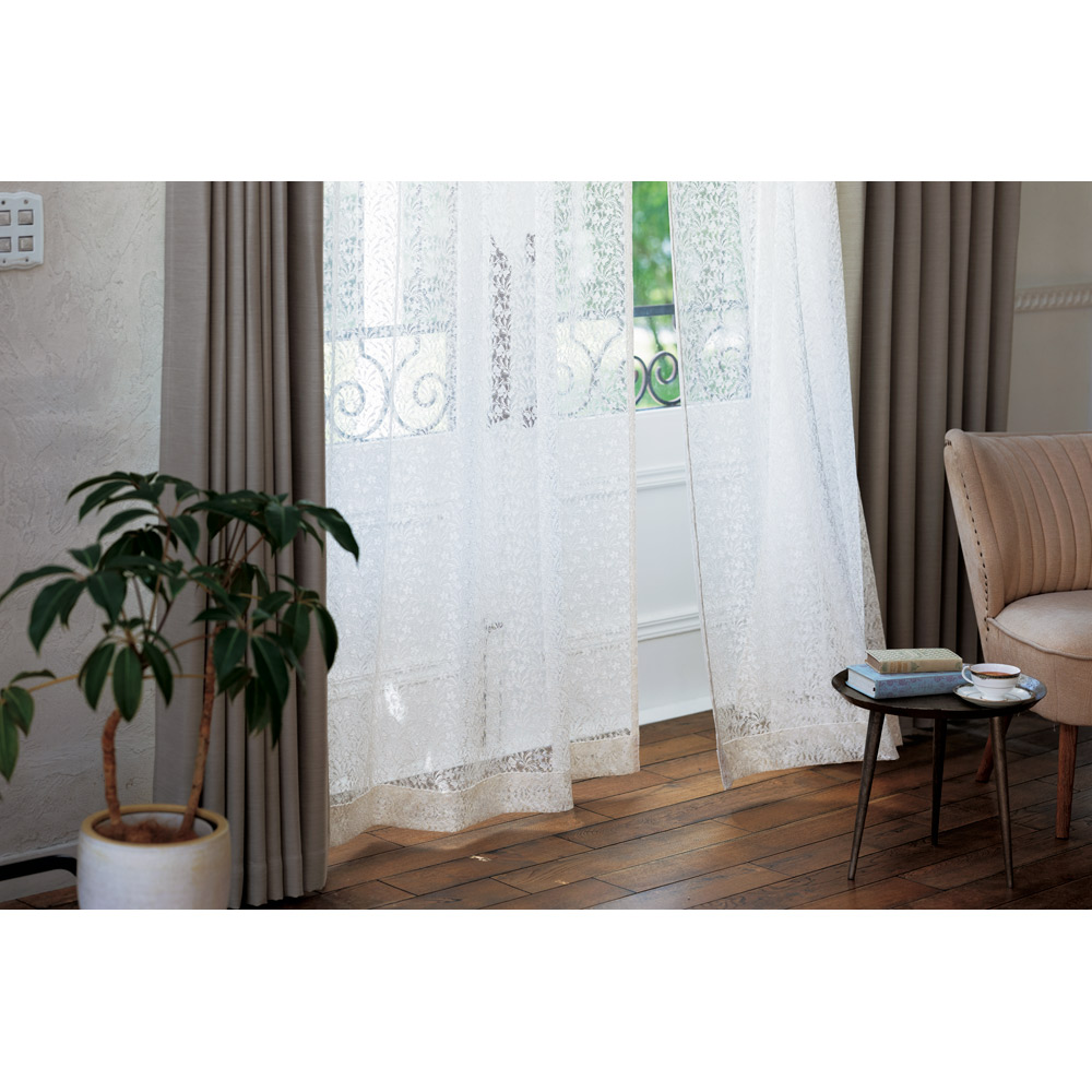 レトロな雰囲気が漂うレースデザイン。窓辺が華やぎます。花や葉のモチーフの中に、さりげなく蝶々があしらわれています。やわらかいチュールレースカーテンで、風にふわりとなびけば、まるで蝶々が舞っているようです。どこかレトロな雰囲気が漂うのも魅力です。【ポイント1】チュール生地に草花や蝶をデザイン六角形の編み目のチュール生地に草花や蝶をデザインした、高級感のあるカーテンです。【ポイント2】日本製丁寧な縫製など、安心と信頼の日本製です。【ポイント3】丸洗いOK洗濯機で洗えるので、いつでも清潔にお使いいただけます。