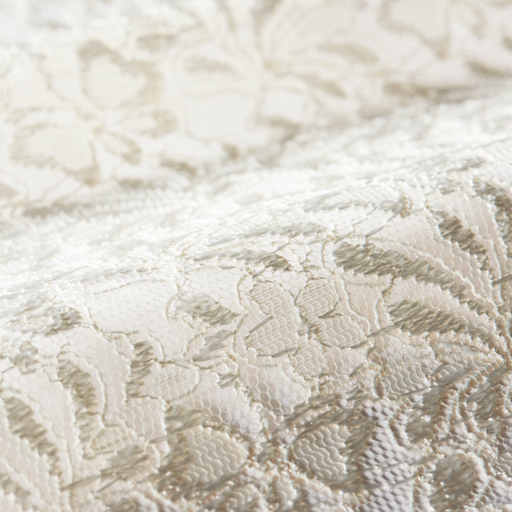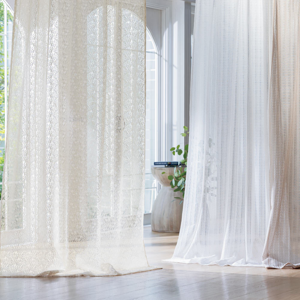 光に映え、窓一面に広がる繊細なモチーフが華やかなチュールレース。主役になる贅沢な総レースはどこかレトロな印象。