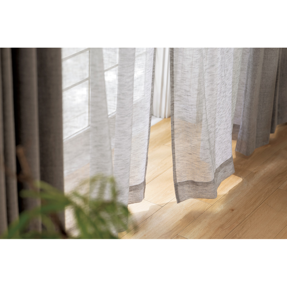 • (ウ)ライトグレー(写真はリネンライク遮光カーテン グレーとのコーディネート) リネン調の風合いでナチュラルな窓辺に。光を通すと実際の生地より明るく見えます。 ※お届けはレースカーテンのみになります。(100cm幅2枚組・200cm幅1枚)