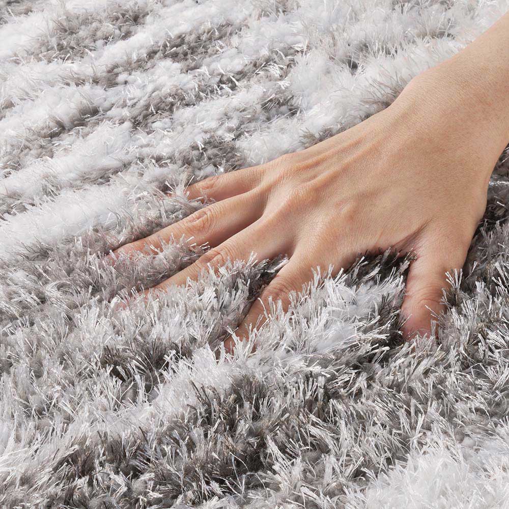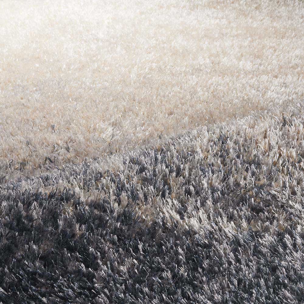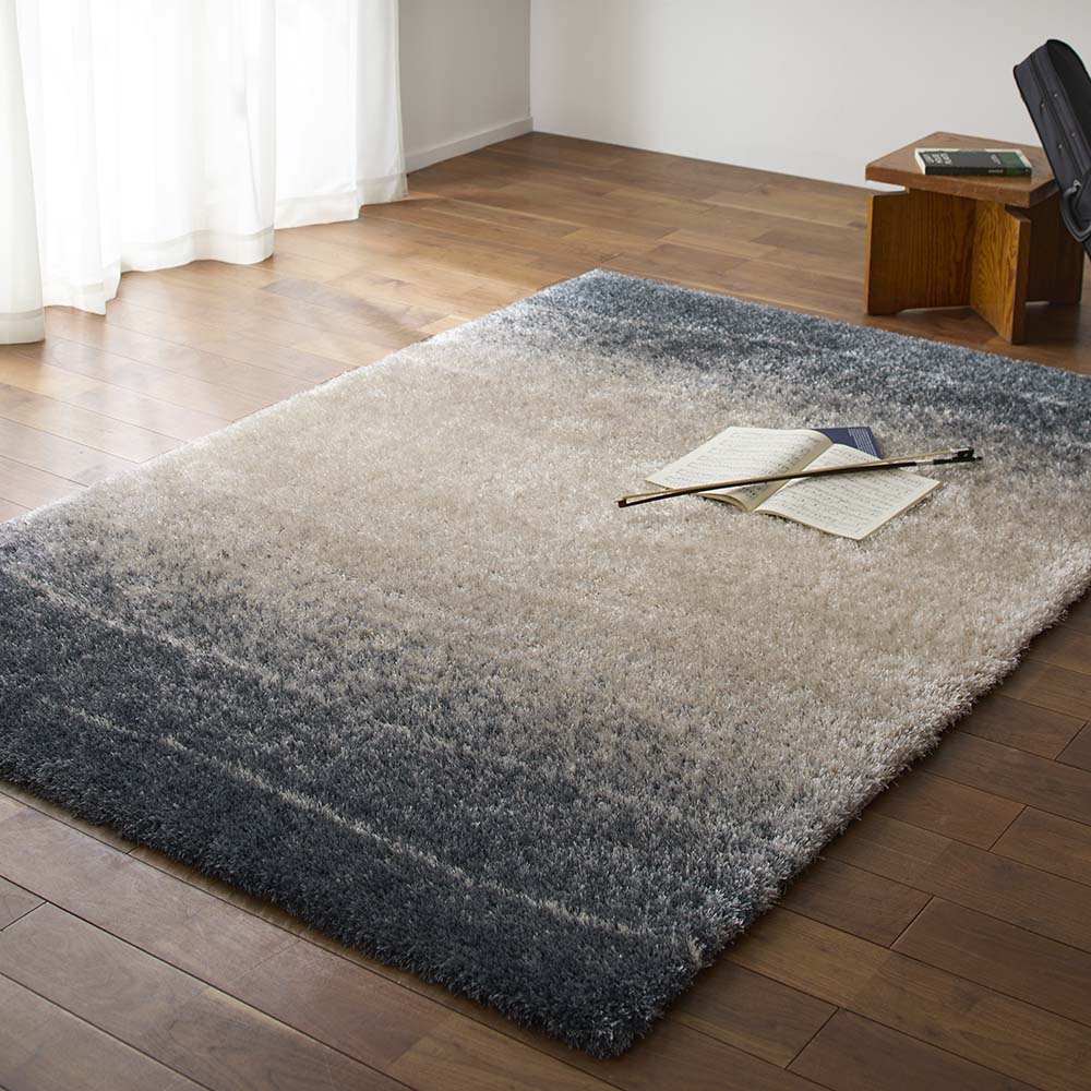 毛足を楽しむ人気のシャギーに、柔らかなグラデーション柄が登場。リラックスしたゆとりの時間にふさわしい新しいシャギーです。ふかふかな足元。見るたび触れるたび、心ときめく、表情豊かなシャギー。太さの異なるポリエステル糸を巧みにミックスして織り上げられ、光の当たり方や見る角度によって変化する豊かな表情が魅力の、トルコ製ウィルトン織シャギーラグです。空間にアートのような洗練された印象をもたらすグラデーション柄はグレー系とベージュ系の2タイプで、インテリアに美しく溶け込みます。柔らかな感触とふかふかの踏み心地を実現しており、一年を通して快適に使えます。ホットカーペットの上にも敷くことができます。●ポリエステル素材の特長合成繊維の中でも特に熱や摩擦に強い素材です。吸湿性が低く速乾性にも優れているため乾きが早いのが特長。水による収縮が起きにくく型崩れしにくい点も魅力です。さらに遊び毛がほとんど出ないためお手入れも簡単。加工がしやすく、きれいな色合いを表現できるのもポリエステルならではです。●ウィルトン織とは18世紀中期・イギリスのウィルトン市で発祥した機械織りのラグで、次のような特徴があります。(1)自由な表現力と高いデザイン性無地・柄ラグ共にパイルの長さを自由に変えることができることであらゆる表現力を持ち、デザイン性の高いラグを作ることができます。(2)頑丈なつくりで、耐久性がある表面のパイル糸以外に、地径糸(じだていと)・覆糸(おおいいと)・緯糸(よこいと)の4種類の糸を、織りこんで作られています。表面のパイル糸が下糸に直接絡み合わせて織り込んであるるために、パイルが抜けにくく、しっかりとした耐久性に優れた仕上がりになっています。