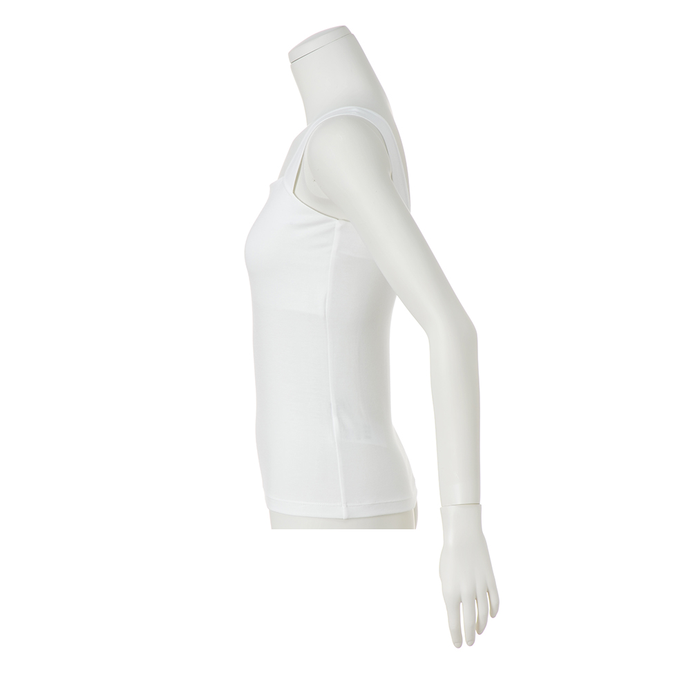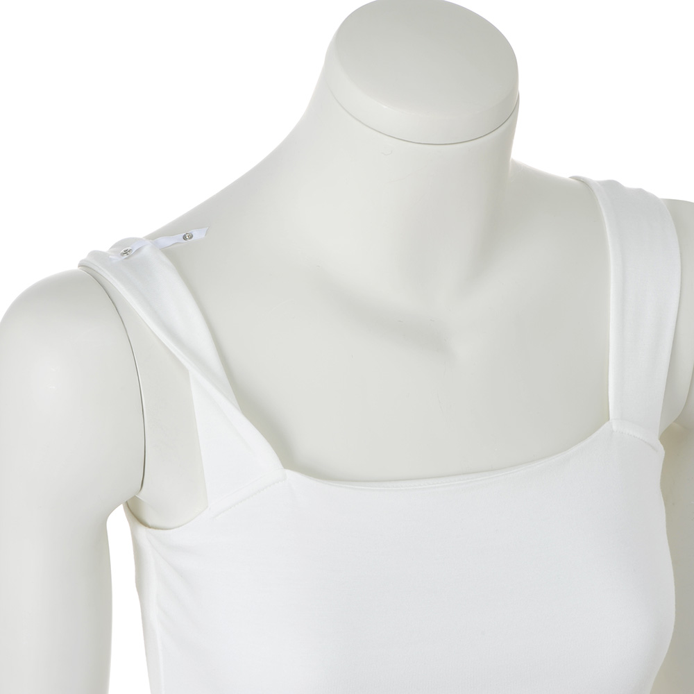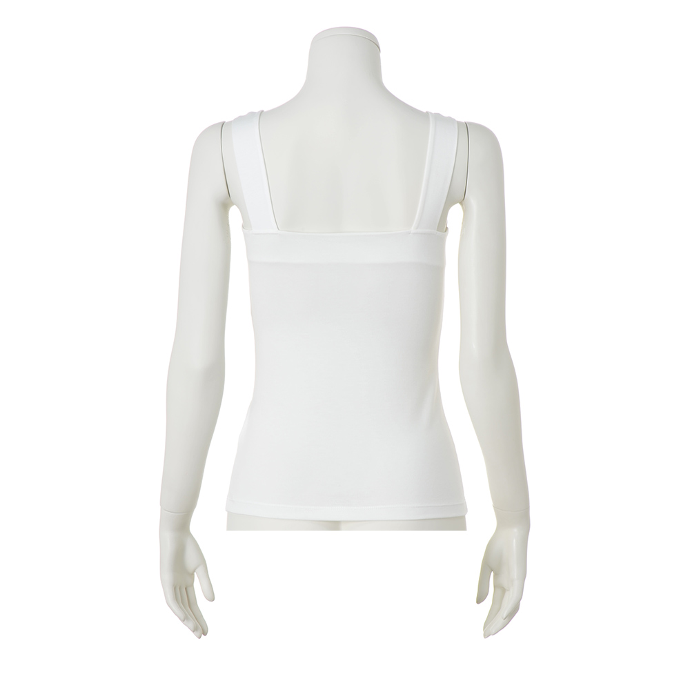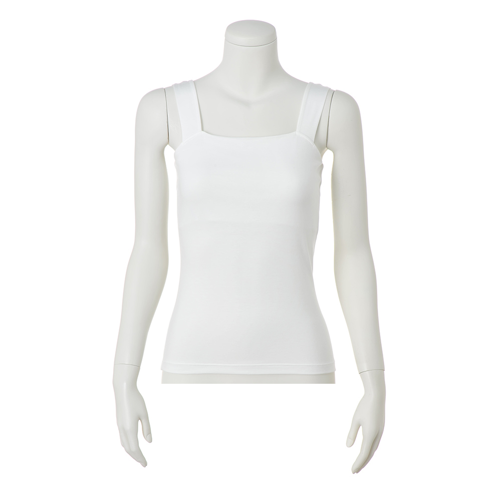 重ね着の完成度が上がるキャミソール。とろみがあって伸びやかなベア天竺ジャージー、重ねる服を選ばない直線的なネックライン、ブラ紐を留めるホルダー付きの太幅ショルダーなど、きれいな着こなしのために拘りぬいて仕上げました。≫ POINTストラップホルダー、バスト下まである見返し、高めの脇下で、透けやインナーのチラ見えを防止。