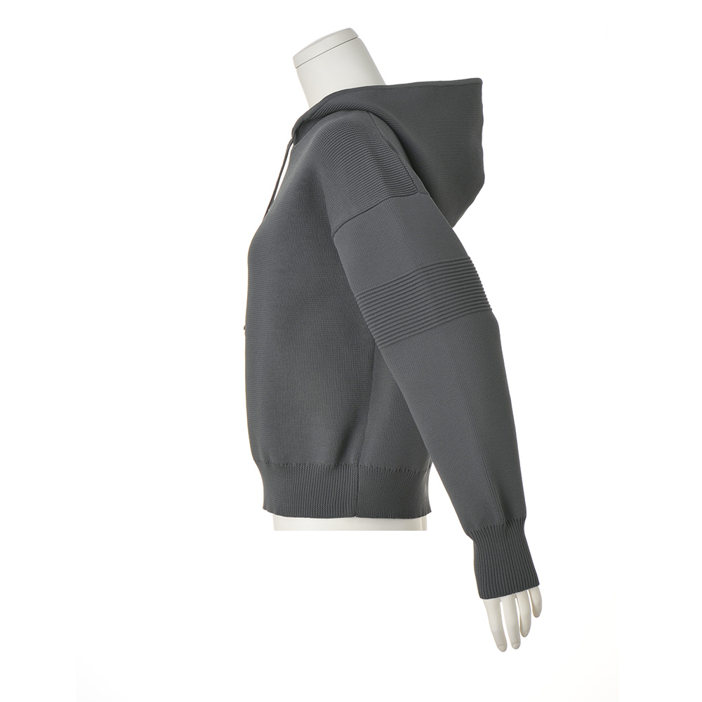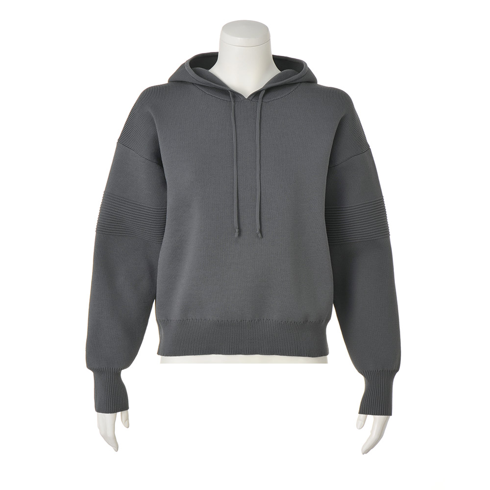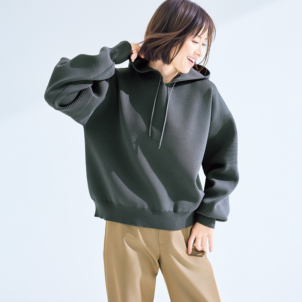 MINIMAL CHIC私らしさが輝く洗練ベーシックシンプルだから際立つ研ぎ澄まされた洗練とセンスが光る拘りで、着ればたちまちお洒落な印象に!フォルムだけじゃない、着心地だって快適。魅力あふれるフォルミックニットのパーカは、ポリエステル糸を4本取りにしてしっかりと編み上げた総針編み。適度にハリ感があるのでふっくら印象的な形を表現でき、しかも意外なほど軽い着心地。サラリとした肌触りも快適です。二の腕辺りにはタック編みで表現したボーダー切り替えが、フード周りには同素材のコードがあしらわれているのもさりげないアクセント。分量感のあるフォルムと短め丈の旬バランスが、カジュアルスタイルをアップデートしてくれます。≫ POINT身体のラインを拾わないしっかりとした編み地は軽く、ドライタッチ、イージーケアにも大満足。