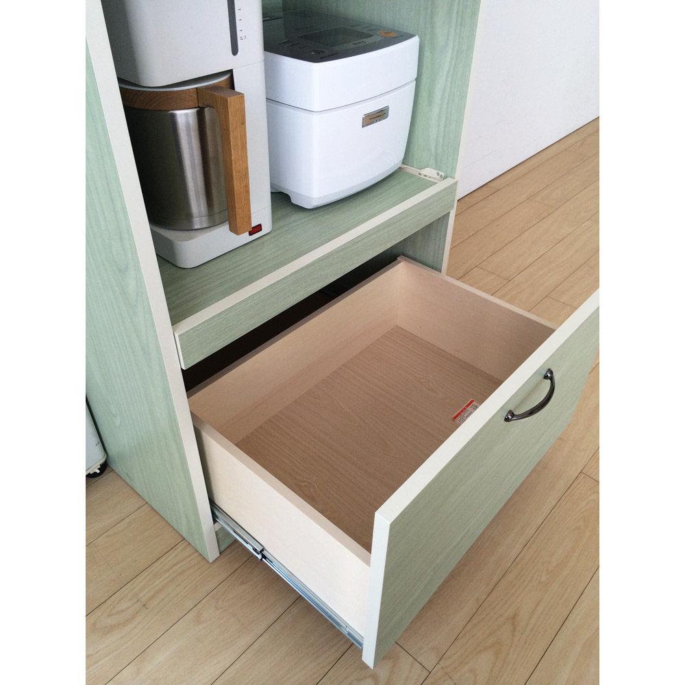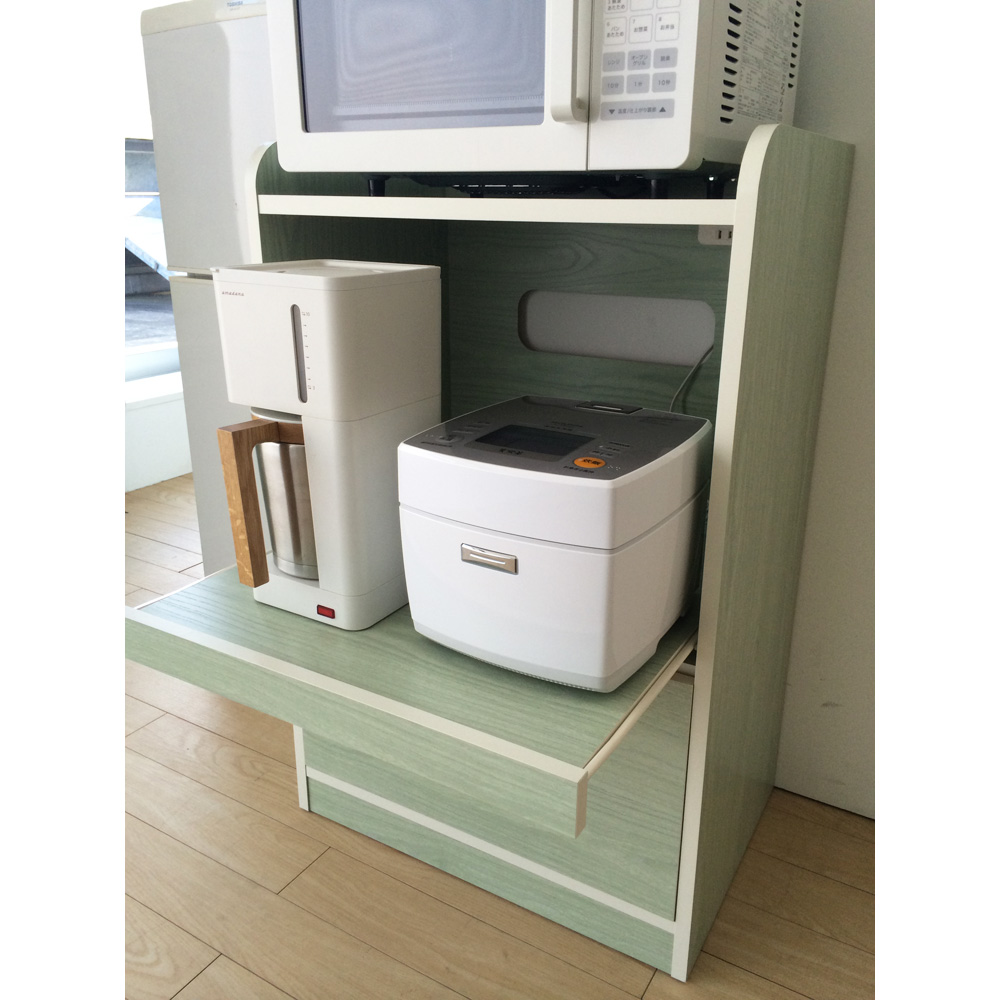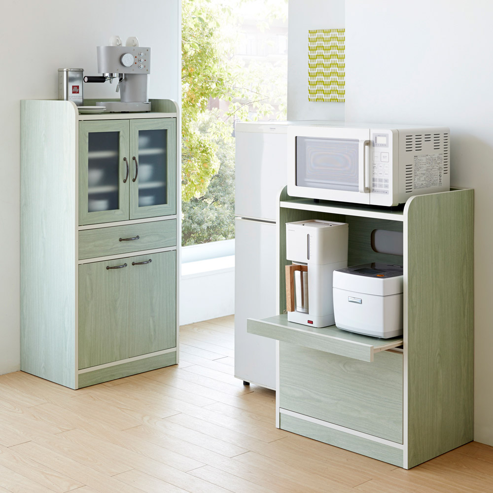 キッチン収納にコンパクトでおしゃれな電子レンジ台が登場。スライドテーブル付きで蒸気の出るキッチン家電にも対応します。細かい所に配慮した日本製、完成品のレンジラックです。使用例:グリーン系 左からキャビネット大(高さ120.5cm)、レンジ台小(高さ90.5cm)コンパクトでも使いやすさ満点のキッチン収納狭いキッチンに対応する、コンパクトな「ミニ食器棚シリーズ」のレンジ台。食器・家電をもおしゃれに収納でき、圧迫感もありません。新婚やお引っ越し、一人暮らしにおすすめのキッチン収納です。シリーズ品のキャビネットと合わせて使えば、統一感のあるキッチンに。※お届け商品 左からグリーン系、ホワイトレンジ台小(高さ90.5cm)スライドテーブル付きのコンパクトなレンジ台。色はグリーン系とホワイトの2色からお選びください。写真左: 左からレンジ台小、キャビネット小 写真右:左からレンジ台大、キャビネット大選べる2サイズ高さは、小(高さ90.5cm)、大(高さ120.5cm)の2タイプ。使用例:グリーン系 レンジ台小家電が使いやすいスライドテーブル手前に引き出せるスライドテーブルがついているので蒸気が出る家電にも対応しています。家電を使わないときは、スライドテーブルを収納して見た目すっきり。2口コンセント付きオープン部の奥に2口コンセント付き。キッチン家電の収納・使用に便利です。小物やストックの整理に便利な引き出し下部には、たっぷりサイズの引き出し付き。フルスライドレールを採用しているので手前までしっかりと引き出せます。薄型なので場所をとりませんレンジ台・キャビネットともに奥行約40cmの薄型。使用例:ホワイト 左からキャビネット大、レンジ台小日本製、組み立て不要の完成品使いやすさに配慮した日本製。完成品なので、届いたその日からすぐ使えます。