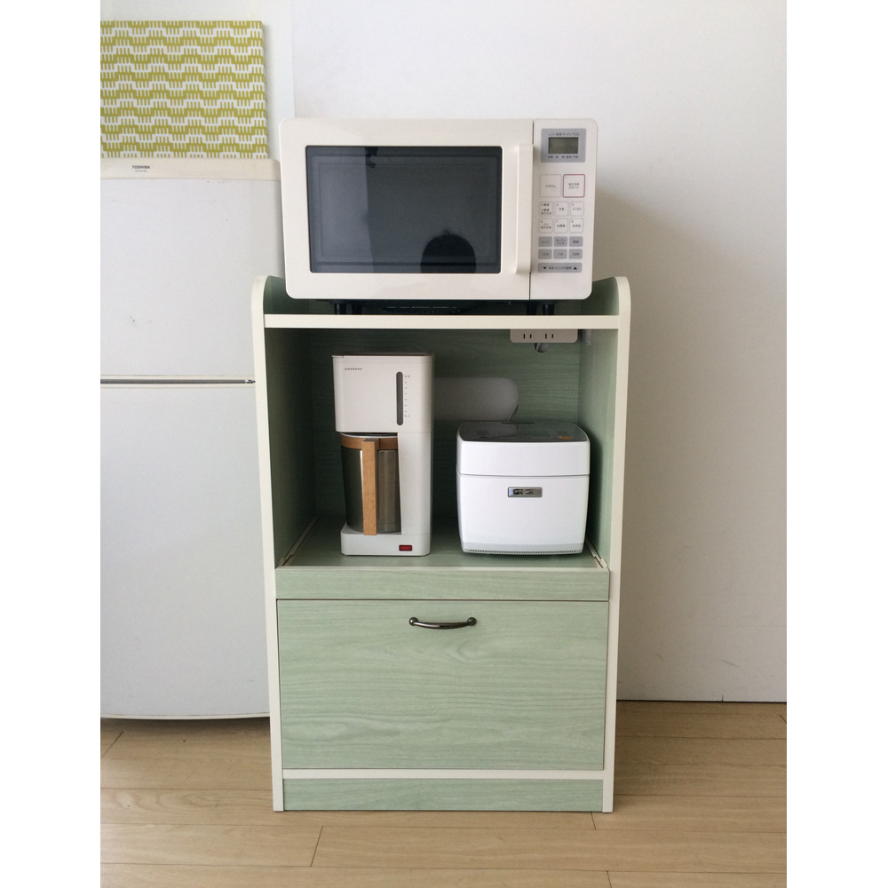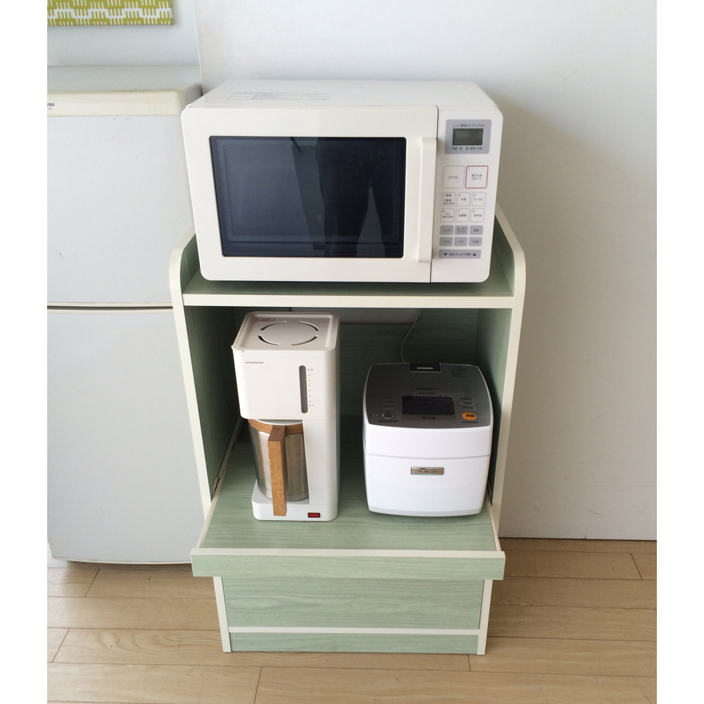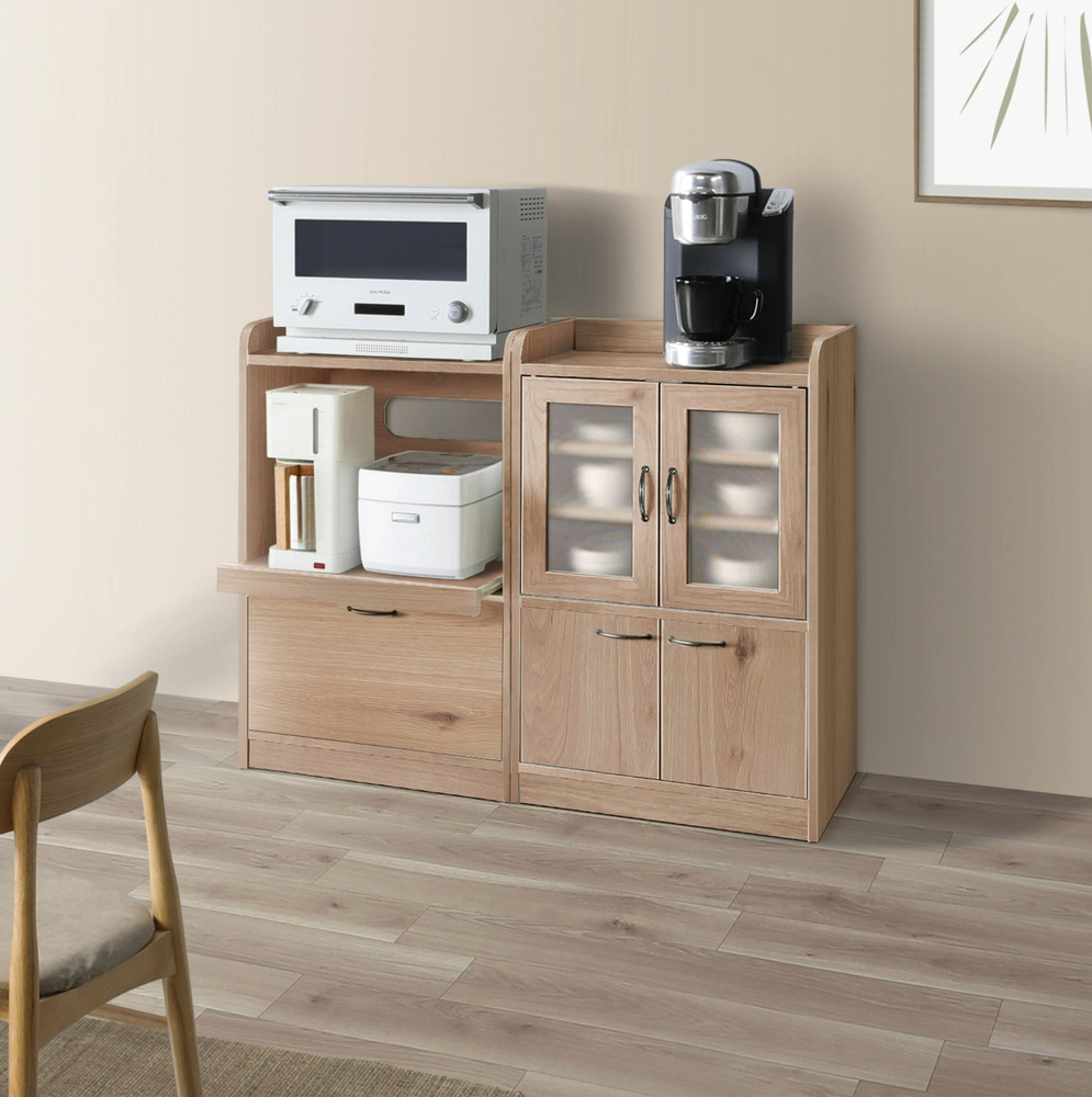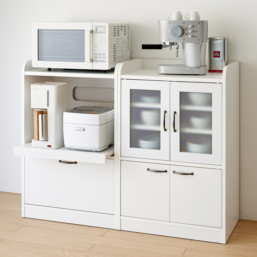 キッチン収納にコンパクトでおしゃれな電子レンジ台が登場。スライドテーブル付きで蒸気の出るキッチン家電にも対応します。細かい所に配慮した日本製、完成品のレンジラックです。使用例:グリーン系 左からキャビネット大(高さ120.5cm)、レンジ台小(高さ90.5cm)コンパクトでも使いやすさ満点のキッチン収納狭いキッチンに対応する、コンパクトな「ミニ食器棚シリーズ」のレンジ台。食器・家電をもおしゃれに収納でき、圧迫感もありません。新婚やお引っ越し、一人暮らしにおすすめのキッチン収納です。シリーズ品のキャビネットと合わせて使えば、統一感のあるキッチンに。※お届け商品 左からグリーン系、ホワイトレンジ台小(高さ90.5cm)スライドテーブル付きのコンパクトなレンジ台。色はグリーン系とホワイトの2色からお選びください。写真左: 左からレンジ台小、キャビネット小 写真右:左からレンジ台大、キャビネット大選べる2サイズ高さは、小(高さ90.5cm)、大(高さ120.5cm)の2タイプ。使用例:グリーン系 レンジ台小家電が使いやすいスライドテーブル手前に引き出せるスライドテーブルがついているので蒸気が出る家電にも対応しています。家電を使わないときは、スライドテーブルを収納して見た目すっきり。2口コンセント付きオープン部の奥に2口コンセント付き。キッチン家電の収納・使用に便利です。小物やストックの整理に便利な引き出し下部には、たっぷりサイズの引き出し付き。フルスライドレールを採用しているので手前までしっかりと引き出せます。薄型なので場所をとりませんレンジ台・キャビネットともに奥行約40cmの薄型。使用例:ホワイト 左からキャビネット大、レンジ台小日本製、組み立て不要の完成品使いやすさに配慮した日本製。完成品なので、届いたその日からすぐ使えます。