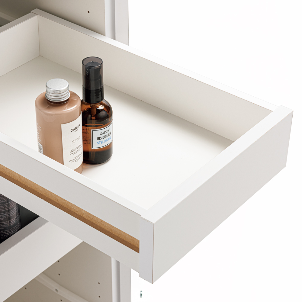 中身が落ちにくいトレー式引き出しは、3cm間隔で高さ調節が可能。