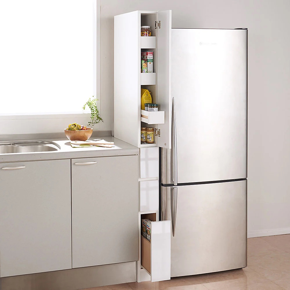 使用イメージ 上段は奥の物が出しやすいスライドトレー、下段は引き出し3杯付き。 ※写真は別売りの幅20cm奥行45cmタイプです。