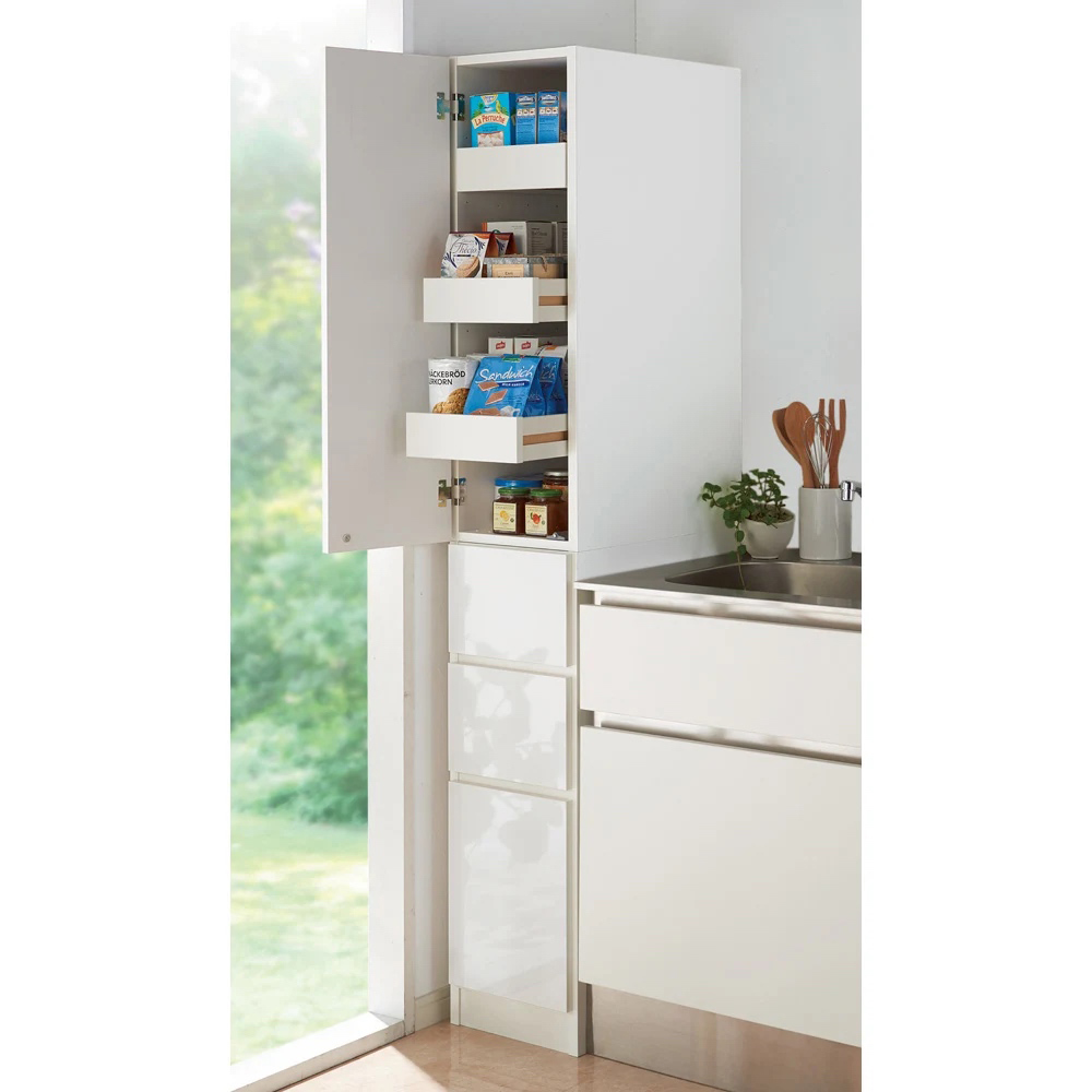使用イメージ 上段は奥の物が出しやすいスライドトレー、下段は引き出し3杯付き。 ※写真は別売りの幅20cm奥行45cmタイプです。