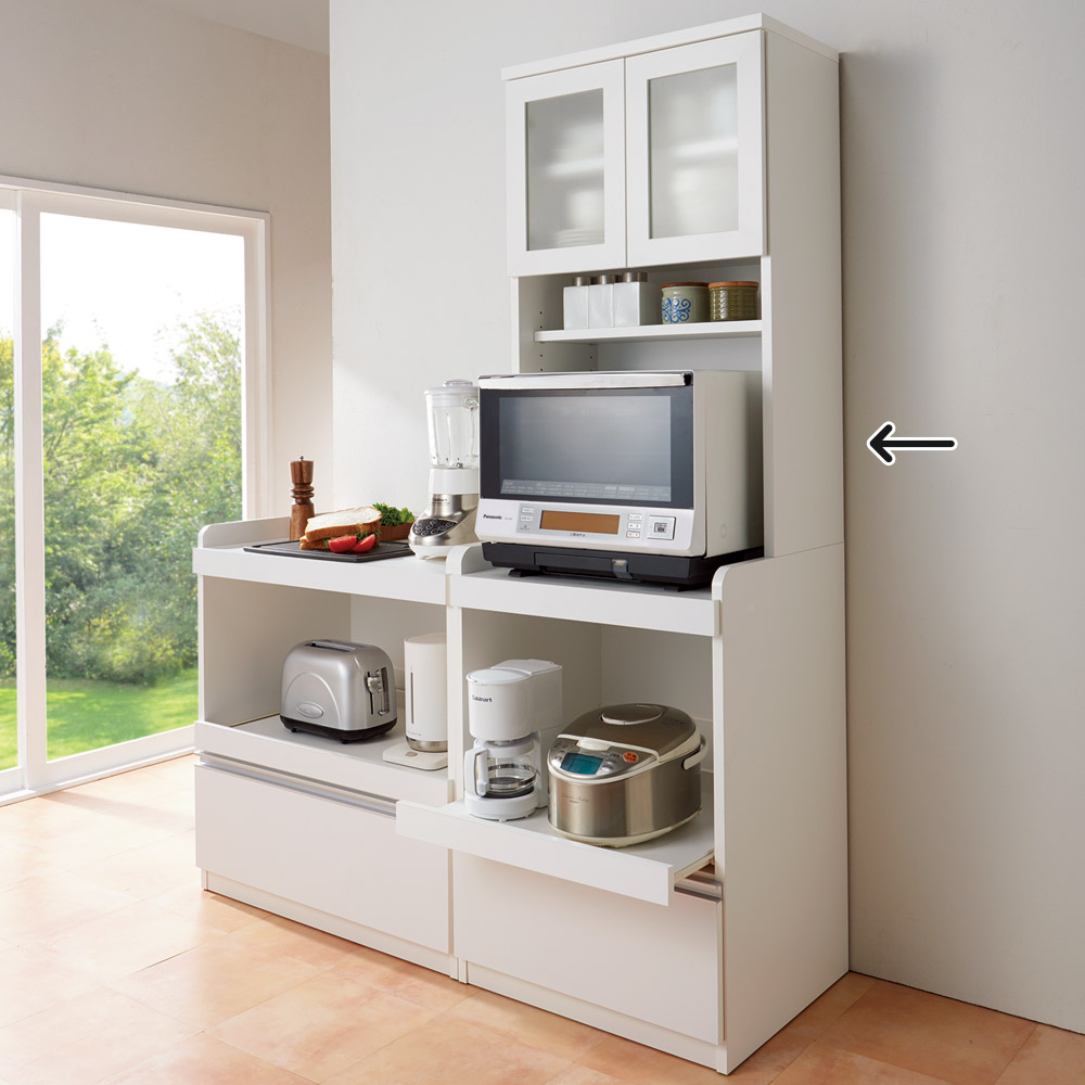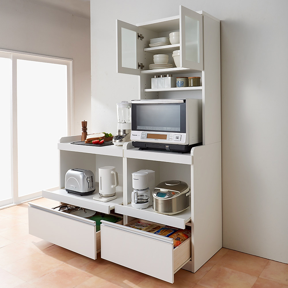 ロータイプで使いやすく、大型レンジがラクラク収納可能な奥行50cmのゆとりサイズのレンジボード。家電収納として余裕のあるスペースで使いやすく並べられます。完成品だから面倒な組立がなく、お届け後すぐに使えます。奥行50cmのゆとりサイズで、大型レンジが主役のキッチンに。◆本体奥行き50cmなので大型レンジをラクラク収納可能な食器棚です。◆余裕のあるスペースで必要な家電を使いやすく並べられるカップボードです。◆狭いキッチンでもキッチン家電、キッチン用品をまとめてコンパクトに収納が可能です。家電が使いやすいこだわり設計のレンジ台◆定位置が必要なキッチン家電収納のために、コンセントつきのオープン家電台を装備。◆レンジ、トースター、炊飯器、ホットプレートなどキッチン家電は全てこれ1台にまとめて収納できます。たっぷりな収納力で、家事をサポートするアイデア収納◆引き出しは滑らかに開閉するスライドレールつき。◆買い置きを保管するキッチンストッカー・食品ストッカーの代わりにも。◆収納力を重視し、キッチンラック・キッチン収納庫を置けないご家庭でも使いやすく設計。上台は収納物が一目でわかる観音開き仕様◆ガラスはわずかに収納物が見える擦りガラス仕様で上品に生活感を目隠し。◆収納内部棚板奥行37センチだから、大型パスタ皿まで収納可能です。◆扉部分に取っ手はなく、すっきりとしたデザインにもこだわりました。水に強い素材選びで、おしゃれでストレスフリーなキッチンに。◆キッチンボードの前面は美しさと機能性を兼ね備えたポリエステル化粧合板。◆清潔感のある美しい見た目はもちろん、汚してもふき取り掃除の簡単な魅力的な素材です。安心と信頼の国内生産品のキッチンカウンター◆熟練の家具職人がひとつずつ丁寧に仕上げたワンランク上の家電ラック・レンジラックです。◆細部の丁寧な仕上がりなど、国産品ならではの高品質なキッチン収納棚・ダイニングボードを台所に置いてお楽しみください。