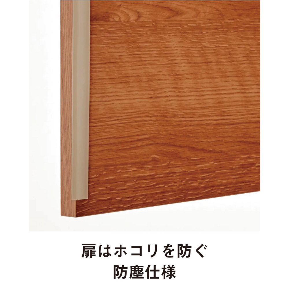 【扉収納部】収納物にあわせて6cm間隔で調節できる可動棚付きなので、かさばる洗剤などのストックに便利です。扉はほこりを防ぐ防塵フラップ付き。 ※写真は幅60cmタイプです。