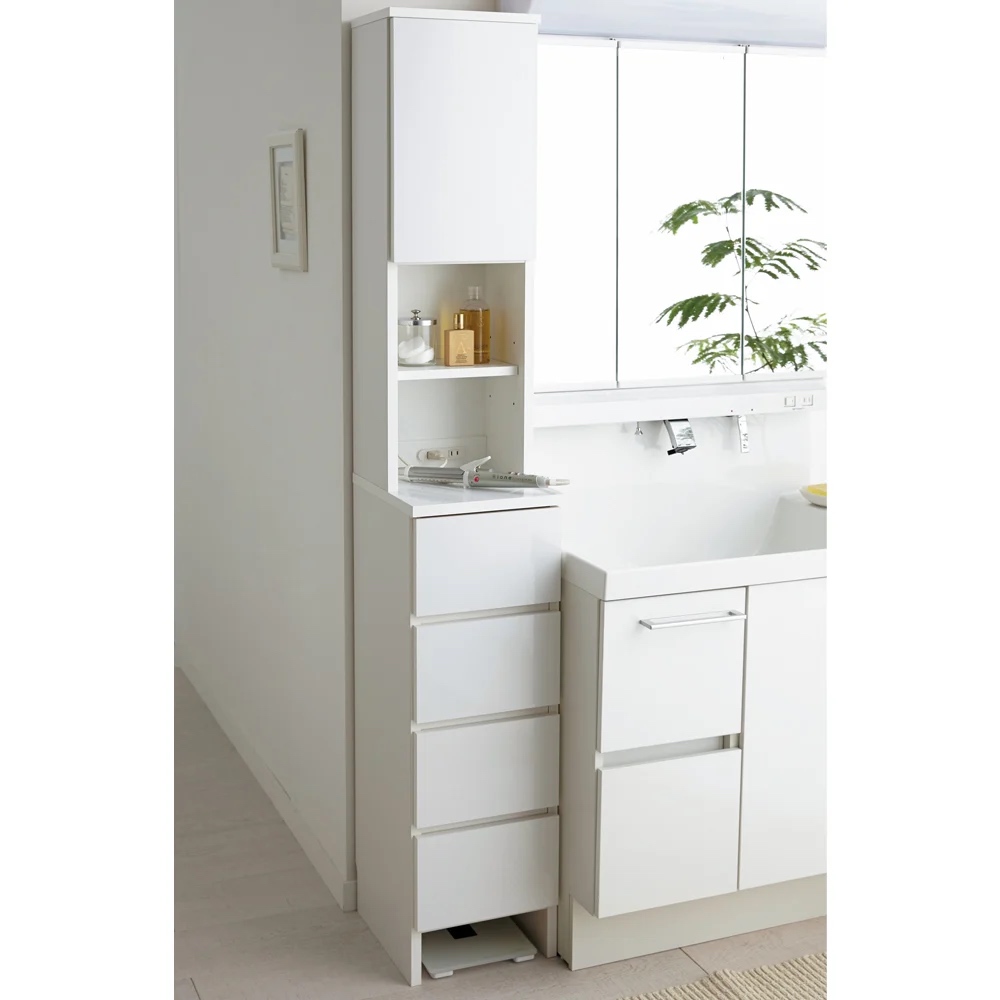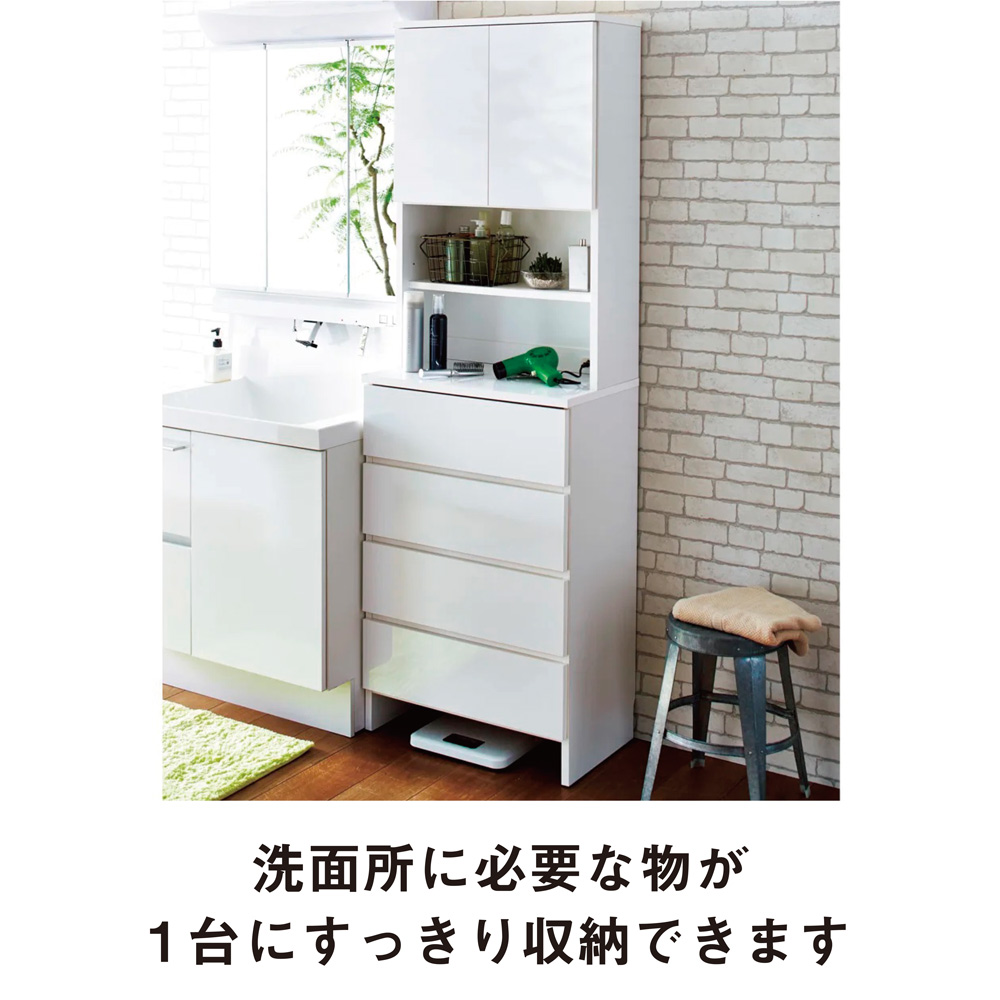 (ア)ホワイト 洗面所の収納にぴったりの清潔感のあるサニタリーチェスト。棚と引き出し、コンセント付きで快適なパウダールームに。 ※写真は幅60cmタイプです。
