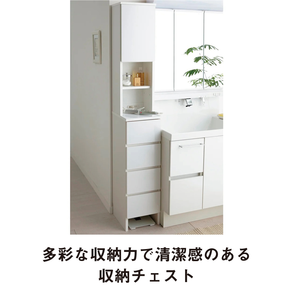 これ1台置くだけで、洗面所の使いやすさがアップする多機能収納庫。収納はもちろん、毎日使うものをすぐ手に取れる場所に置けるから、忙しい朝の身支度やメイクもスムーズに! 定番人気の国産ディノス家具完成品です。洗面所を、もっと「使いやすい空間」にしたい方におすすめ!●化粧品から美容家電、タオルや衣類まで、洗面所に必要な物はこれ1台でOKの万能チェストです。●薄型の奥行35cmながら充実の収納力が魅力です。充実の収納力(1)「上部の扉収納」●扉内部には収納する物に合わせて高さを調節できる便利な可動棚(3段階調節)付き。●洗剤類やシャンプーの詰め替え、お掃除シートのストックなどたっぷり収納できます。●扉で目隠しできるので、見た目のごちゃつきを解消。洗面所がいつもすっきり美しく片付きます。●上扉はワンタッチで開くプッシュ式。忙しい時も片手で簡単に開きます。●扉と扉の間には、ホコリが入りにくいように防塵フラップを装備。充実の収納力(2)「コンセント付きのオープンスペース」●中央部は必要なものがすぐ手に取れるオープン部。毎日使うコスメなどを置けば、朝の身支度や夜の寝支度も時短に。●2口コンセント(計1500W)付きなので、電動歯ブラシやシェーバーなど美容家電の充電スペースにも。ドライヤーなどもサッと使えて便利です。●タオルや着替えの一時置きにも。ちょっと何か置きたいという時に助かります。充実の収納力(3)「下部の引き出し収納」●綿棒やコンタクトレンズ、石鹸などこまごまとしたものから、タオルや下着、パジャマまでたっぷり収納できます。●引き出しは全てスライドレール&ストッパー付き。スムーズに開閉できて、大きく引き出しても抜け落ちないので安心です。●引き出しは同じ大きさ同士で簡単に入れ替えできます。(最上段除く)●ご家族で一人一段ずつ自分の引き出しとして使う、使用頻度が高いものを上になど、いろいろな使い方ができます。水周りで使いやすいように考えられた仕様です●(ア)ホワイトの前面、中央の天板は水ハネに強いポリエステル化粧合板を使用しました。●足元には高さ10cmのスペースがあり、体重計が置けます。●幅木よけカットが施してあり、壁にぴったり設置が可能です。設置場所に合わせて選べる豊富なサイズ展開と2色のカラー●幅30cmから7.5cmずつ、幅75cmまでの7サイズ展開です。●圧迫感の少ない奥行35cmで、狭い脱衣所や洗面所でも使いやすい壁面収納家具です。●清潔感があり室内が明るく見える(ア)ホワイト、木目調で落ち着いた雰囲気の(イ)ブラウンをご用意しました。シリーズ商品のご案内これ1台で使い心地がよくなるコンセント付き洗面所チェストは以下のシリーズ商品がございます。・幅30cm・幅37.5cm・幅45cm・幅52.5cm・幅60cm・幅67.5cm・幅75cm