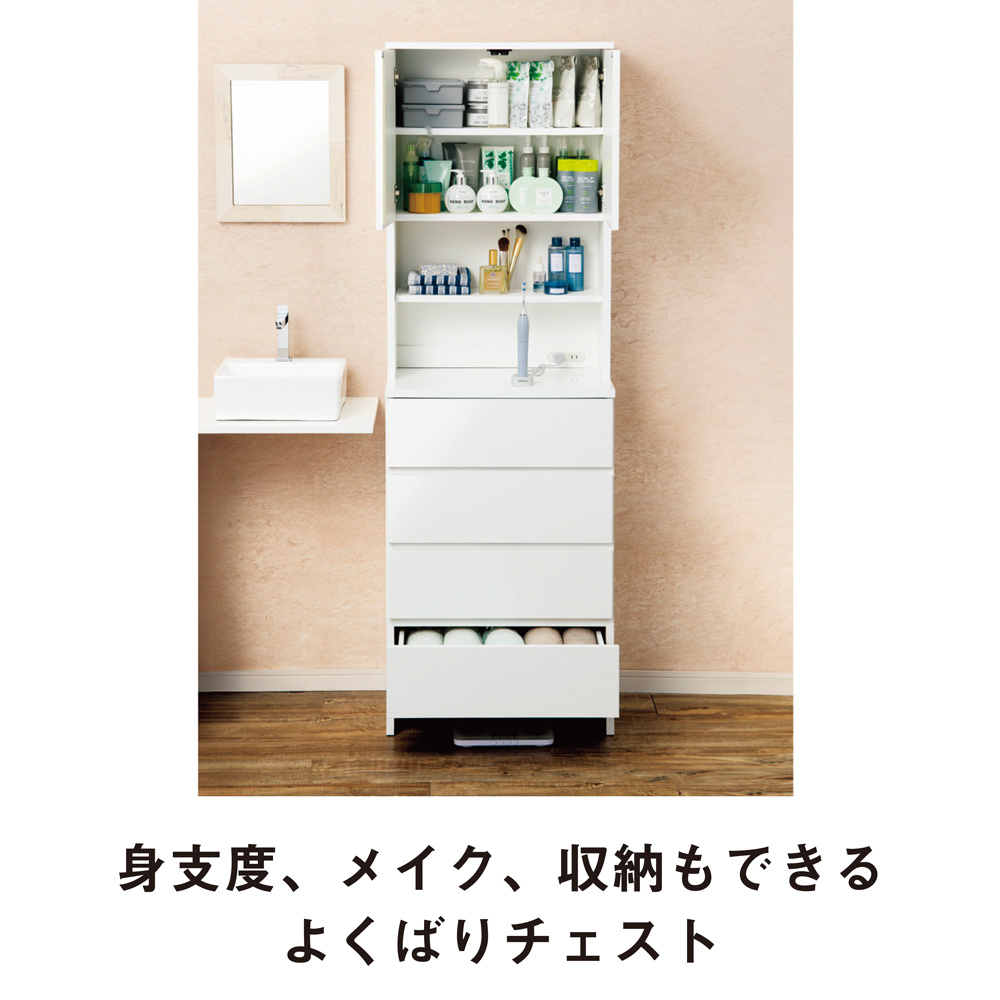 (ア)ホワイト 洗面所の収納にぴったりの清潔感のあるサニタリーチェスト。棚と引き出し、コンセント付きで快適なパウダールームに。 ※写真は幅60cmタイプです。