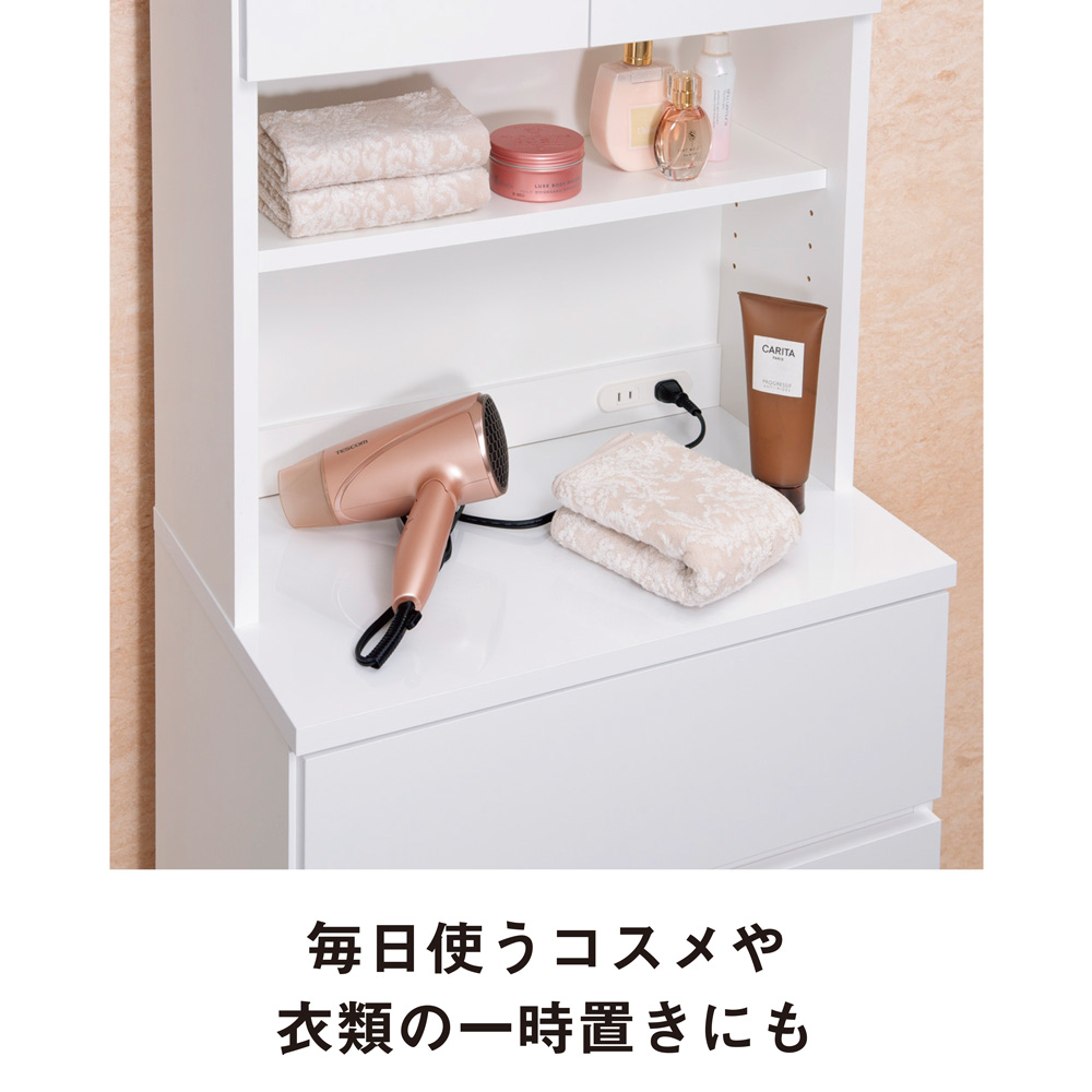 【オープン部】毎日使うコスメやスキンケア用品、衣類やタオルの一時置きに。コンセントも便利。棚板は収納物にあわせて6cm間隔で3段階に調節できます。 ※写真は幅60cmタイプです。