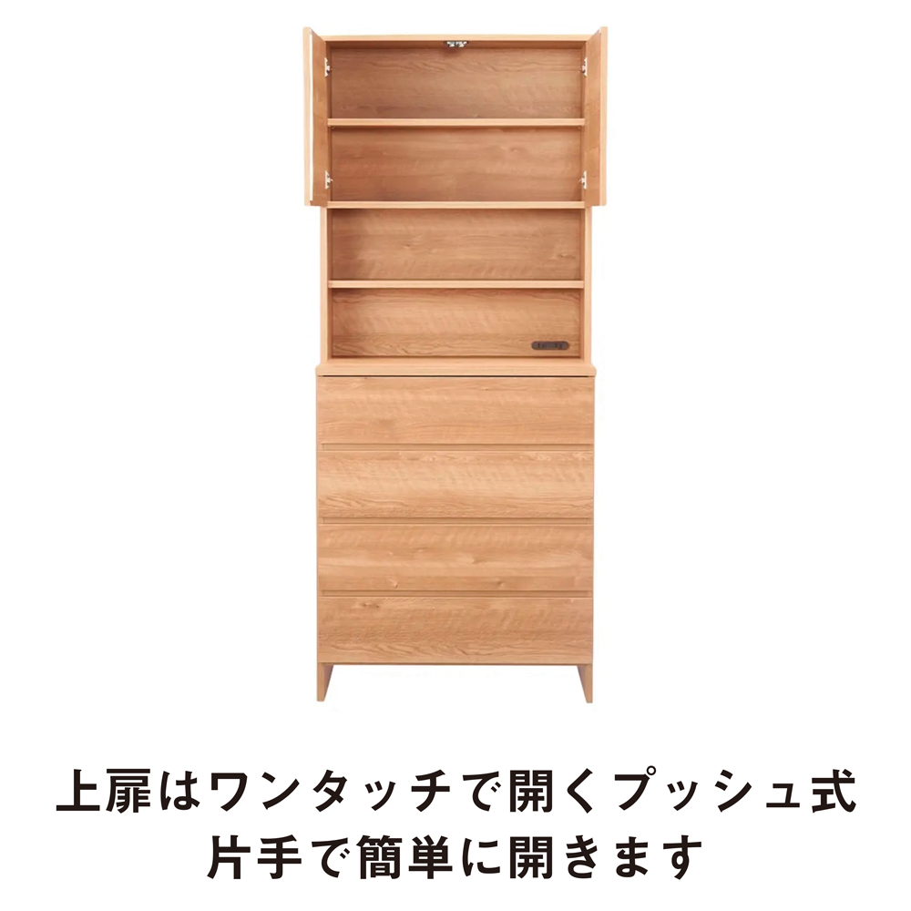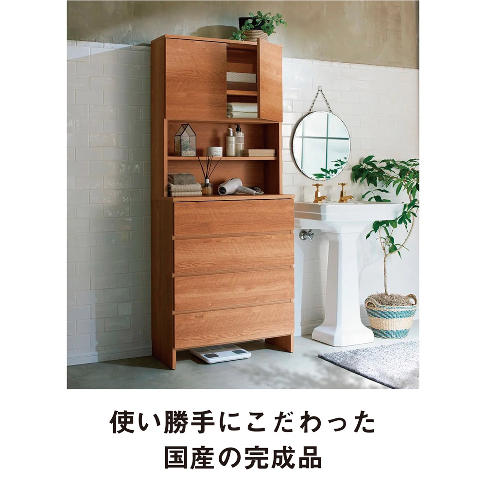 これ1台置くだけで、洗面所の使いやすさがアップする多機能収納庫。収納はもちろん、毎日使うものをすぐ手に取れる場所に置けるから、忙しい朝の身支度やメイクもスムーズに! 定番人気の国産ディノス家具完成品です。洗面所を、もっと「使いやすい空間」にしたい方におすすめ!●化粧品から美容家電、タオルや衣類まで、洗面所に必要な物はこれ1台でOKの万能チェストです。●薄型の奥行35cmながら充実の収納力が魅力です。充実の収納力(1)「上部の扉収納」●扉内部には収納する物に合わせて高さを調節できる便利な可動棚(3段階調節)付き。●洗剤類やシャンプーの詰め替え、お掃除シートのストックなどたっぷり収納できます。●扉で目隠しできるので、見た目のごちゃつきを解消。洗面所がいつもすっきり美しく片付きます。●上扉はワンタッチで開くプッシュ式。忙しい時も片手で簡単に開きます。●扉と扉の間には、ホコリが入りにくいように防塵フラップを装備。充実の収納力(2)「コンセント付きのオープンスペース」●中央部は必要なものがすぐ手に取れるオープン部。毎日使うコスメなどを置けば、朝の身支度や夜の寝支度も時短に。●2口コンセント(計1500W)付きなので、電動歯ブラシやシェーバーなど美容家電の充電スペースにも。ドライヤーなどもサッと使えて便利です。●タオルや着替えの一時置きにも。ちょっと何か置きたいという時に助かります。充実の収納力(3)「下部の引き出し収納」●綿棒やコンタクトレンズ、石鹸などこまごまとしたものから、タオルや下着、パジャマまでたっぷり収納できます。●引き出しは全てスライドレール&ストッパー付き。スムーズに開閉できて、大きく引き出しても抜け落ちないので安心です。●引き出しは同じ大きさ同士で簡単に入れ替えできます。(最上段除く)●ご家族で一人一段ずつ自分の引き出しとして使う、使用頻度が高いものを上になど、いろいろな使い方ができます。水周りで使いやすいように考えられた仕様です●(ア)ホワイトの前面、中央の天板は水ハネに強いポリエステル化粧合板を使用しました。●足元には高さ10cmのスペースがあり、体重計が置けます。●幅木よけカットが施してあり、壁にぴったり設置が可能です。設置場所に合わせて選べる豊富なサイズ展開と2色のカラー●幅30cmから7.5cmずつ、幅75cmまでの7サイズ展開です。●圧迫感の少ない奥行35cmで、狭い脱衣所や洗面所でも使いやすい壁面収納家具です。●清潔感があり室内が明るく見える(ア)ホワイト、木目調で落ち着いた雰囲気の(イ)ブラウンをご用意しました。シリーズ商品のご案内これ1台で使い心地がよくなるコンセント付き洗面所チェストは以下のシリーズ商品がございます。・幅30cm・幅37.5cm・幅45cm・幅52.5cm・幅60cm・幅67.5cm・幅75cm