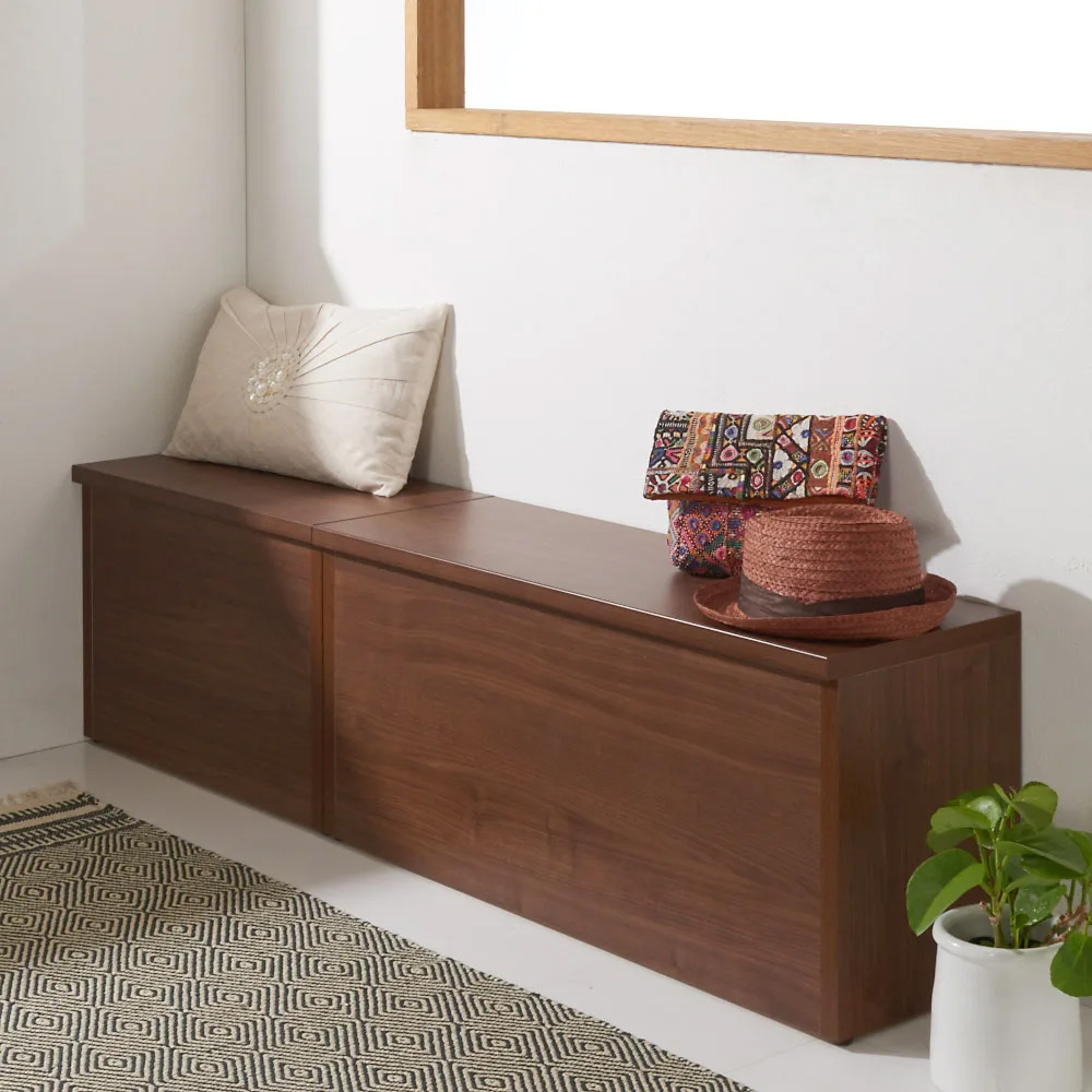 耐荷重100kg!置くだけで、収納と座るスペースが生まれる、便利な収納スツール。収納たっぷりなので空間にゆとりが生まれる収納ボックス。まるでリフォームしたかのような快適な憩いのスペースをお手軽に手に入れられます。防災グッズ収納としてもおすすめです。狭い玄関スペースでも置けちゃう!置くだけで空間にゆとりが生まれます。スペースが狭く限られる玄関まわり。下駄箱に入らない様々なものが玄関周りのごちゃつきを生む悩みの種。一度、玄関収納を見直してみませんか?収納と座るスペースを兼ねられる「収納庫付ベンチ」なら、見た目はすっきり、収納はたっぷり!玄関周りのごちゃつきがすっきり片付きます。本体奥行は31cm。奥行31cmは、狭い玄関にも圧迫感なくすっきり設置できます。幅は60cmです。玄関の広さに合わせてぴったりサイズをお選びいただけます。「座れる」スペースがあるとこんなにも嬉しい!玄関や部屋の一角に置くだけで、手軽に簡単に憩いのスペースが生まれます。(例1)玄関に置いて、靴を履く玄関ベンチとして。来客時にも重宝します。(例2)リビングの窓辺に置いて、読書する窓辺のくつろぎスペースとして。(例3)部屋のコーナーにL字に設置して、収納&くつろぎスペースとして。(例4)リビングのソファのオットマン代わりとして。(例5)来客時のお客様用のサブチェアや小さなお子さまのデスク代わりにも活躍。「座れる」だけじゃない、収納力もばっちり◎ボックスタイプは、座面のフタを開けると中は大容量の収納スペース。ブランケットやヨガマットなどの長物も収納可能です。引き出しタイプは、よく使う物を入れるのに便利。マスクやシューズケア用品なども、すぐにさっと取り出せます。奥行サイズを合わせれば、ボックスタイプと引き出しタイプの合わせ使いもおすすめです。「おしゃれに収納、防災対策もバッチリ」この収納ベンチなら、デザイン性を損なわずに防災グッズを整頓。余裕を持って懐中電灯、水のペットボトル、非常持ち出し袋も収められます。防災グッズの収納場所は緊急時にすぐ取り出せる収納庫付きベンチがおすすめ。毎日使うものだから、嬉しい機能満載!ベンチの角は丸みがあり、足あたりもやさしく安心です。収納庫、引き出しの内部はすべて内部化粧シート貼りを施しており、収納物にやさしいつくりで、庫内を清潔に保てます。引き出しタイプは全段スライドレール付き。最大まで引出しても引き出しが抜け落ちず安心です。選べるカラーア:天然木調の素材感が美しく、玄関を明るく演出する「ナチュラル」イ:シックな色合いと木目に上質感漂う「ダークブラウン」ウ:無塗装のウォルナットのグレイッシュな風合いを忠実に再現、どんなインテリアにも合わせやすい「ウォルナット」微粒子を練り込んだビーズコート仕上げで、摩擦にも強く、傷も目立ちにくく、より本物に近い手触りや木肌のマットな質感まで丁寧に再現しました。エ:玄関が明るく見えて、壁際に置いてもすっきり馴染む「ホワイト」。フラットな見た目でどんなインテリアにも馴染みます。※(ア)ナチュラル(イ)ダークブラウン(エ)ホワイトは、すり傷や汚れに強いクリーンイーゴス(R)を採用。職人技が光る、安心の日本製熟練の家具職人が、一点一点心をこめて丁寧に仕上げております。長く使うものだから、造りのしっかりした収納家具をお求めください。完成品でお届けするので、届いたらすぐにご使用いただけるのが嬉しいポイントです。(水平調整アジャスターのみ、お客様にてお取り付けをお願いいたします)お引越しや模様替えのタイミングでスペースを便利に有効活用してみませんか?高価な備え付け家具やリフォームよりも、お手頃な価格で新生活を始められます。スキマを利用して効率の良い収納術を実践してください。